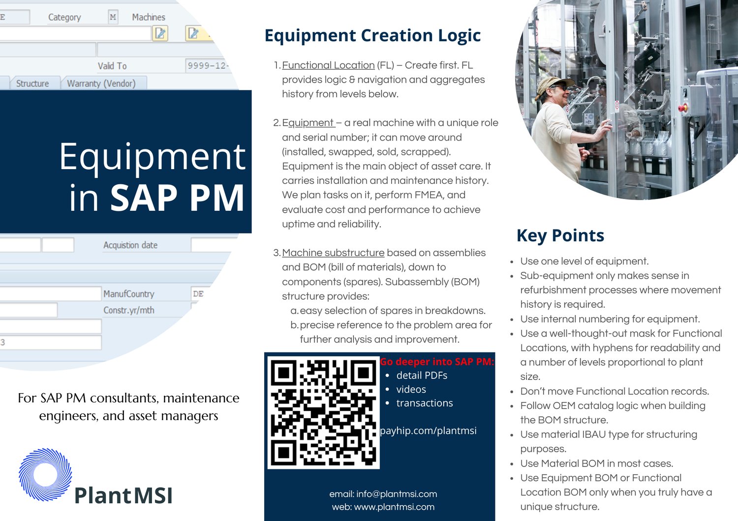 Free video and detail pdf focused on Equipment in SAP Plant Maintenance (SAP PM) with an emphasis on processing and packaging environments (FMCG, Brewing, Tobacco, Pharma). You will learn: