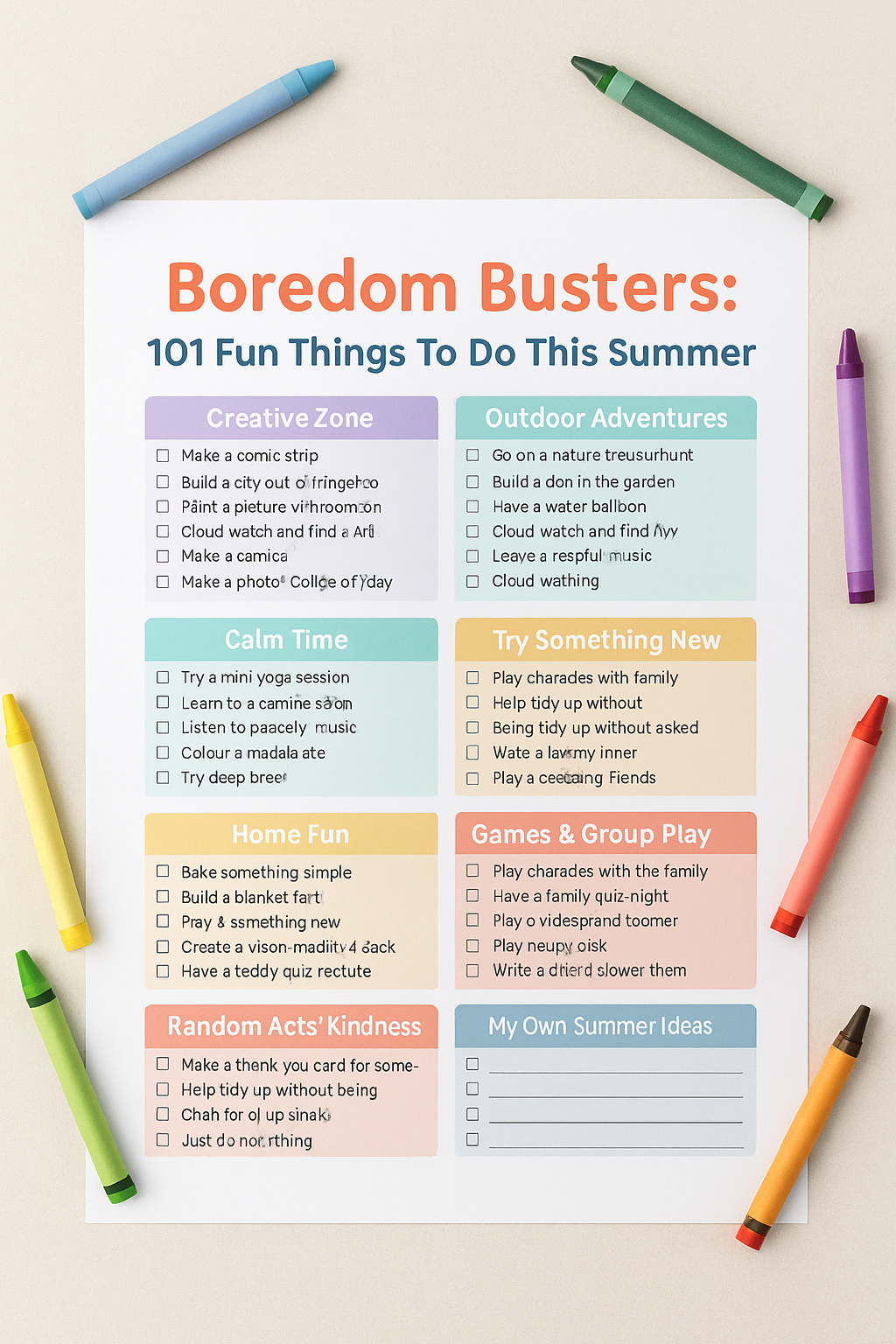 Keep the kids busy, creative, and smiling all summer long with this fun and free printable checklist! Designed for children aged 5–11, this A4 printable includes 101 screen-free, budget-friendly activities to beat boredom and make memories.