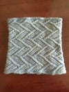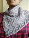The cowl begins with an I-cord cast on, followed by the textured cable pattern, and then bound off using I-cord bind off method. Knit in worsted/aran weight yarn, the cowl has an interesting cabled texture interspersed with moss stitches and works up pretty quick.