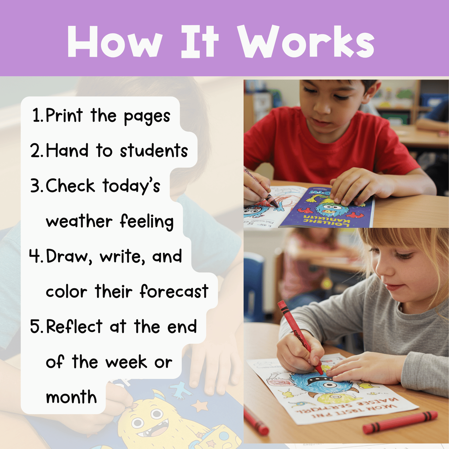 Kids color, write, and reflect on their daily, weekly, and monthly “forecasts” while learning that feelings can change just like the weather. With monster helpers and fun activities, students see that even stormy days can turn sunny again.