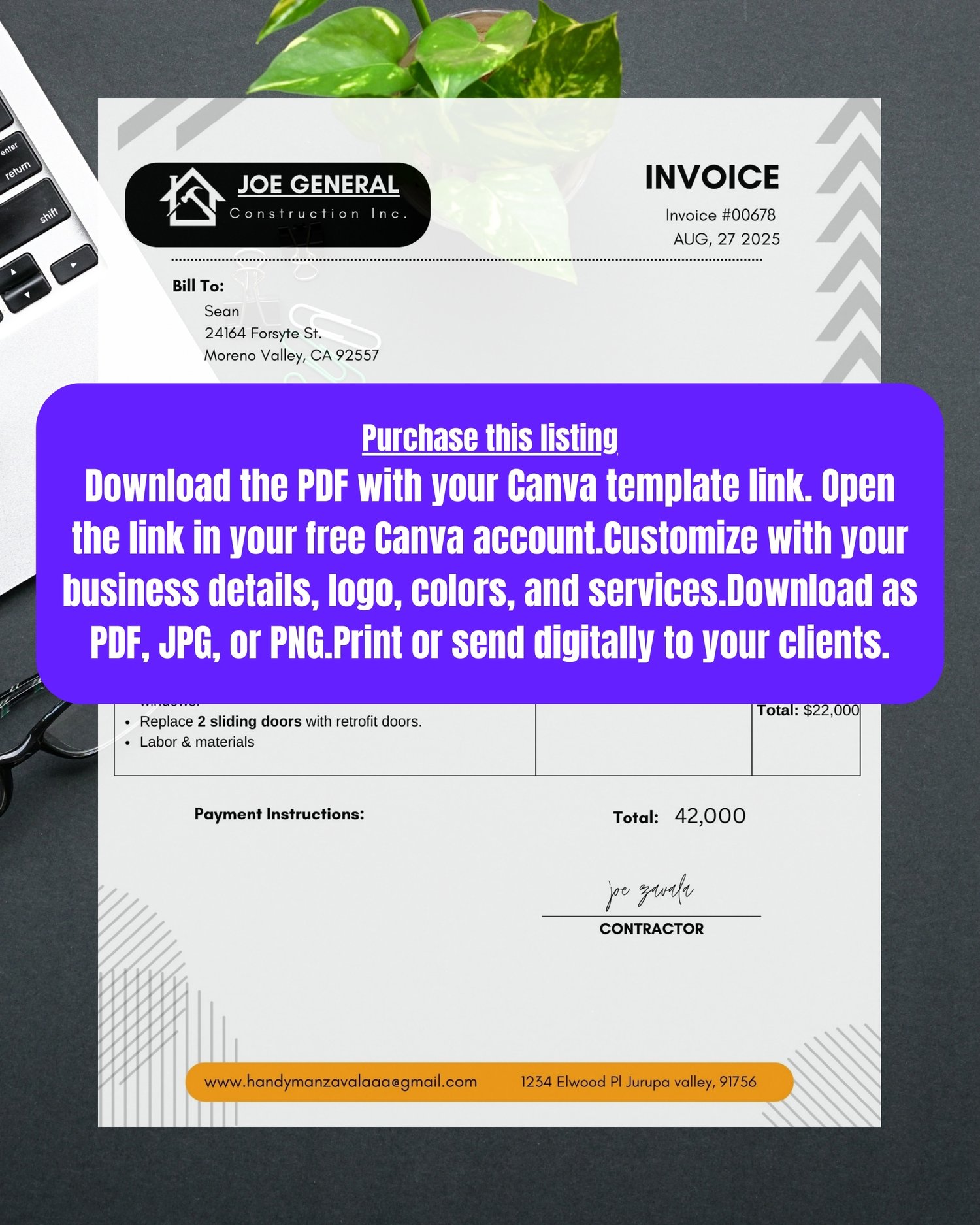 Editable Construction Invoice Template - Contractor Bill Format, Printable Business Invoice, PDF Canva Template, General Contractor Receipt