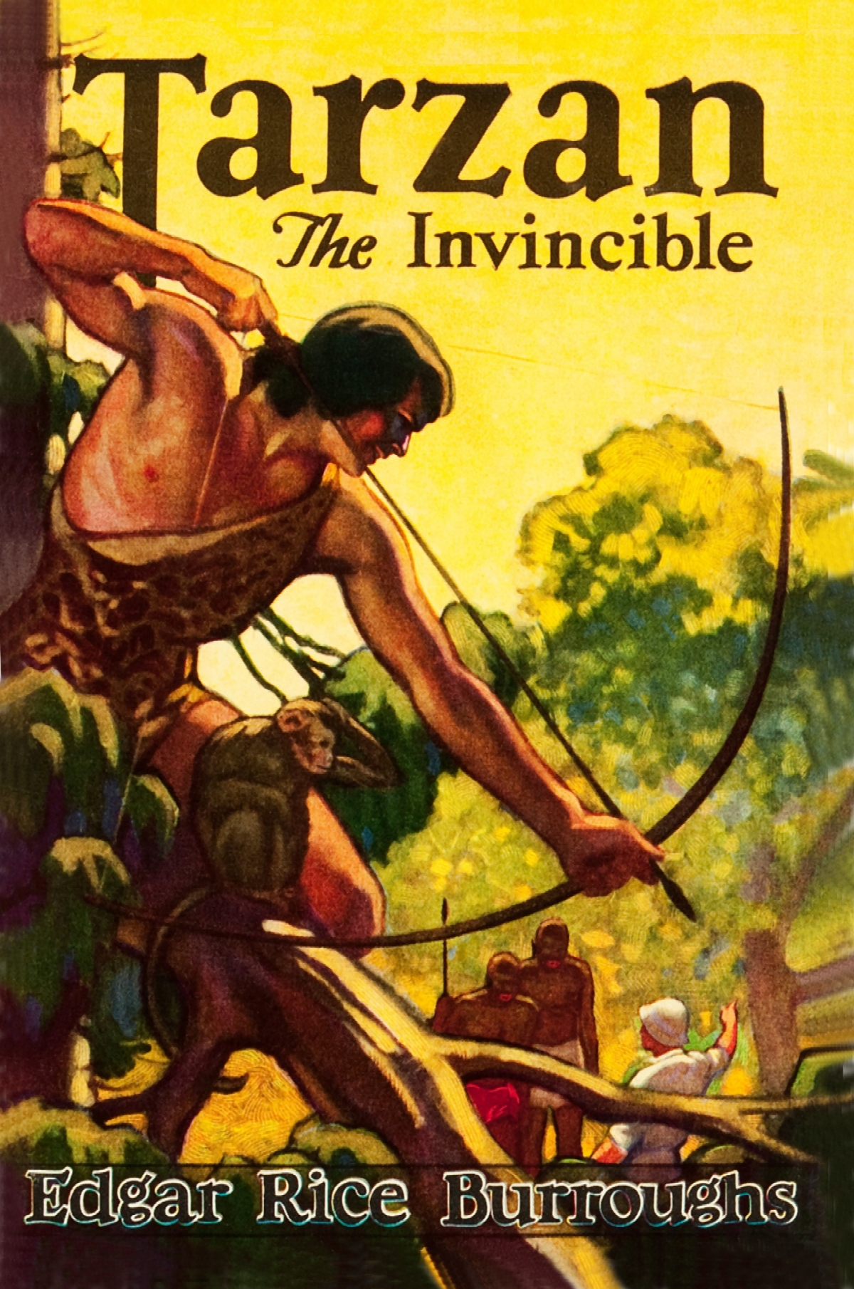 TARZAN, Mighty Hunter, Mighty Fighter! Tarzan the Invincible, embroiled in a thrilling Red plot for the domination of savage Africa. Here, in his own grim jungle and in the wild wastes of mysterious Abyssinia, he meets high adventure. Here, swinging through the giant forests with Tarzan, you will meet new friends and old. Zora Drinov, the beautiful Russian conspirator, will puzzle you to the last. You will like Wayne Colt, the American, and you will think that you know all about him, but you won't. Little Nkima, the tiny monkey, comes again to thwart the enemies of Tarzan; and the incomparable La, High Priestess of the Flaming God, and Tantor, the elephant, and Numa, the lion; the Great Apes, the Waziri and all the myriad life that makes the teeming jungle beloved of Tarzan.