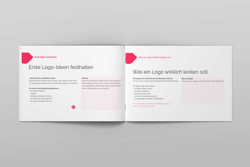 Dieses Workbook hilft dir dabei, dein Business, deine Zielgruppe und die gewünschte Wirkung deiner Marke besser zu verstehen. So entwickelst du Schritt für Schritt mehr Klarheit für Stil, Werte, Farben, Schriftwirkung und die passende Richtung deines Logos.
