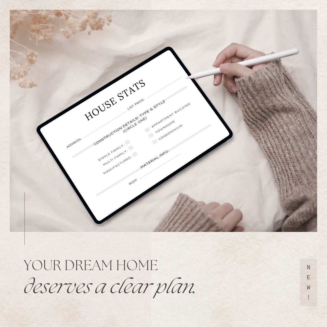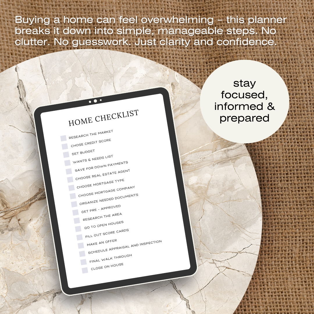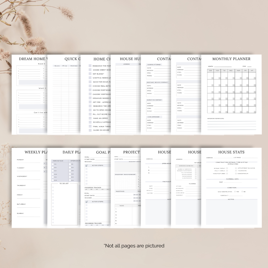 This 44-page Home Buying Planner is designed to help you stay focused, informed, and prepared at every step of your house-hunting journey. Whether you're a first-time buyer or moving into your forever home β this planner gives structure to your thoughts, budget, checklists and vision.