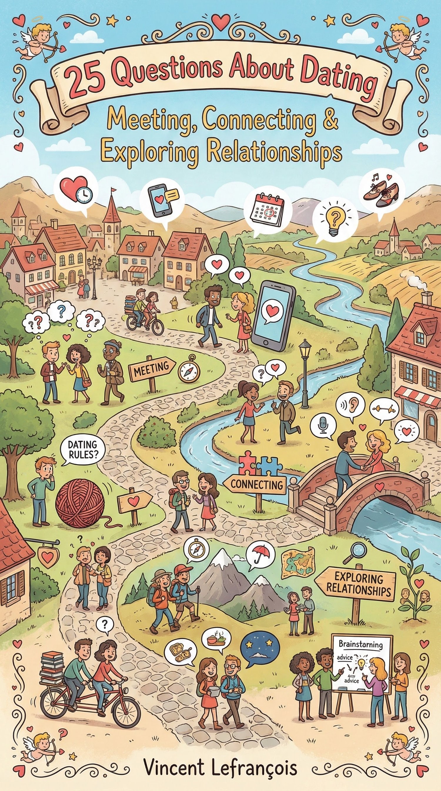 25 Questions About Dating is a beautifully illustrated educational book that explores how people meet, connect, choose partners, and navigate romantic relationships in the modern world.