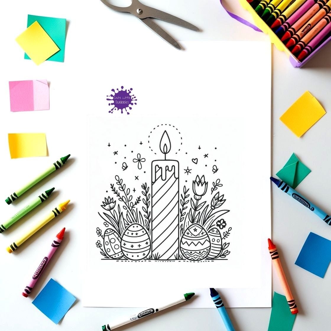 Celebrate the light of Easter with this peaceful coloring page featuring a tall, decorated candle glowing gently above a bed of patterned Easter eggs and blooming spring flowers. With crosses, hearts, and swirls etched into the candle, this gentle design invites young children to reflect and create with joy.