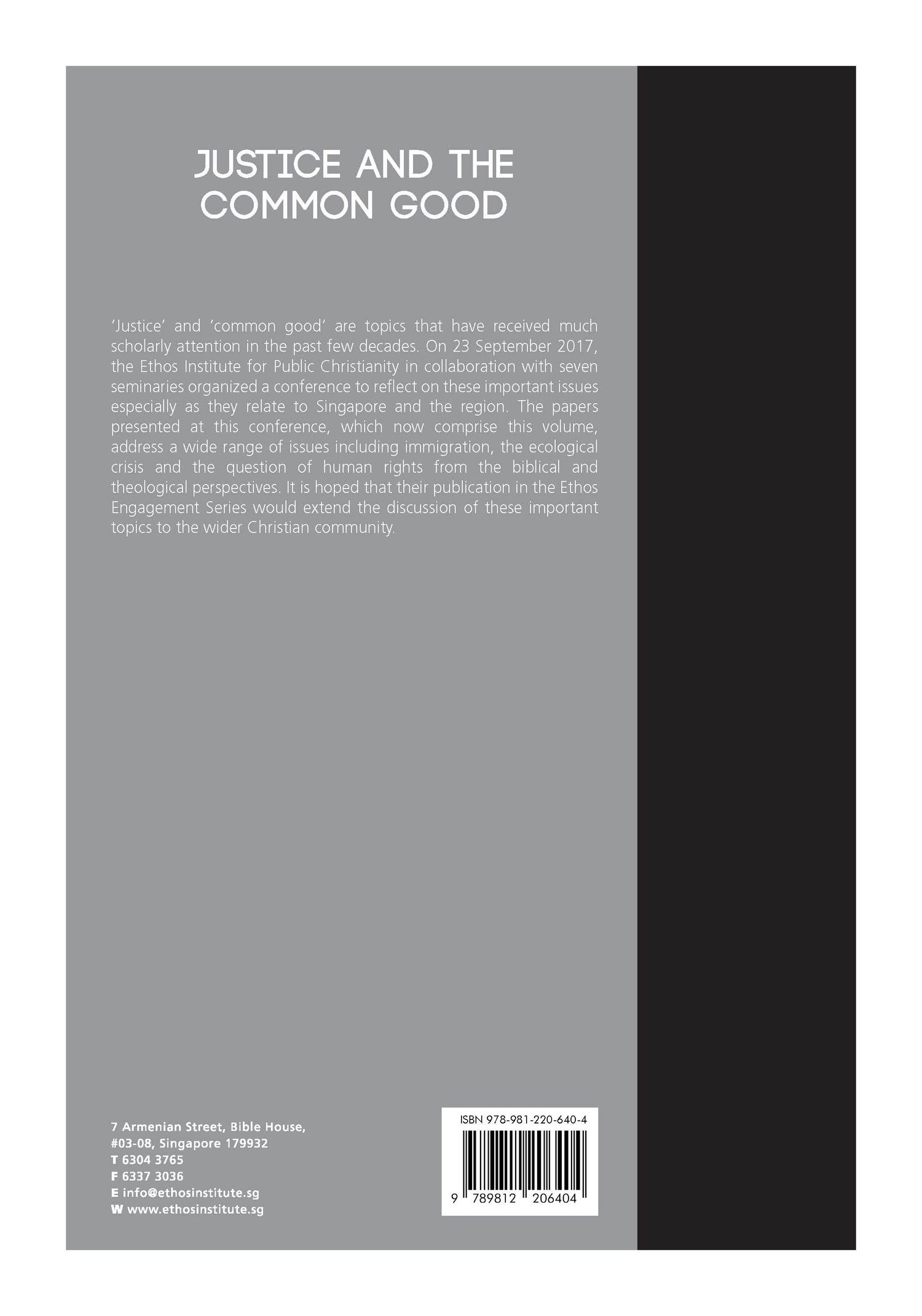 'Justice' and 'common good' are topics that have received much scholarly attention in the past few decades. On 23 September 2017, the Ethos Institute for Public Christianity in collaboration with seven seminaries organized a conference to reflect on these important issues especially as they relate to Singapore and the region. The papers presented at this conference, which now comprise this volume, address a wide range of issues including immigration, the ecological crisis and the question of human rights from the biblical and theological perspectives. It is hoped that their publication in the Ethos Engagement Series would extend the discussion of these important topics to the wider Christian community.