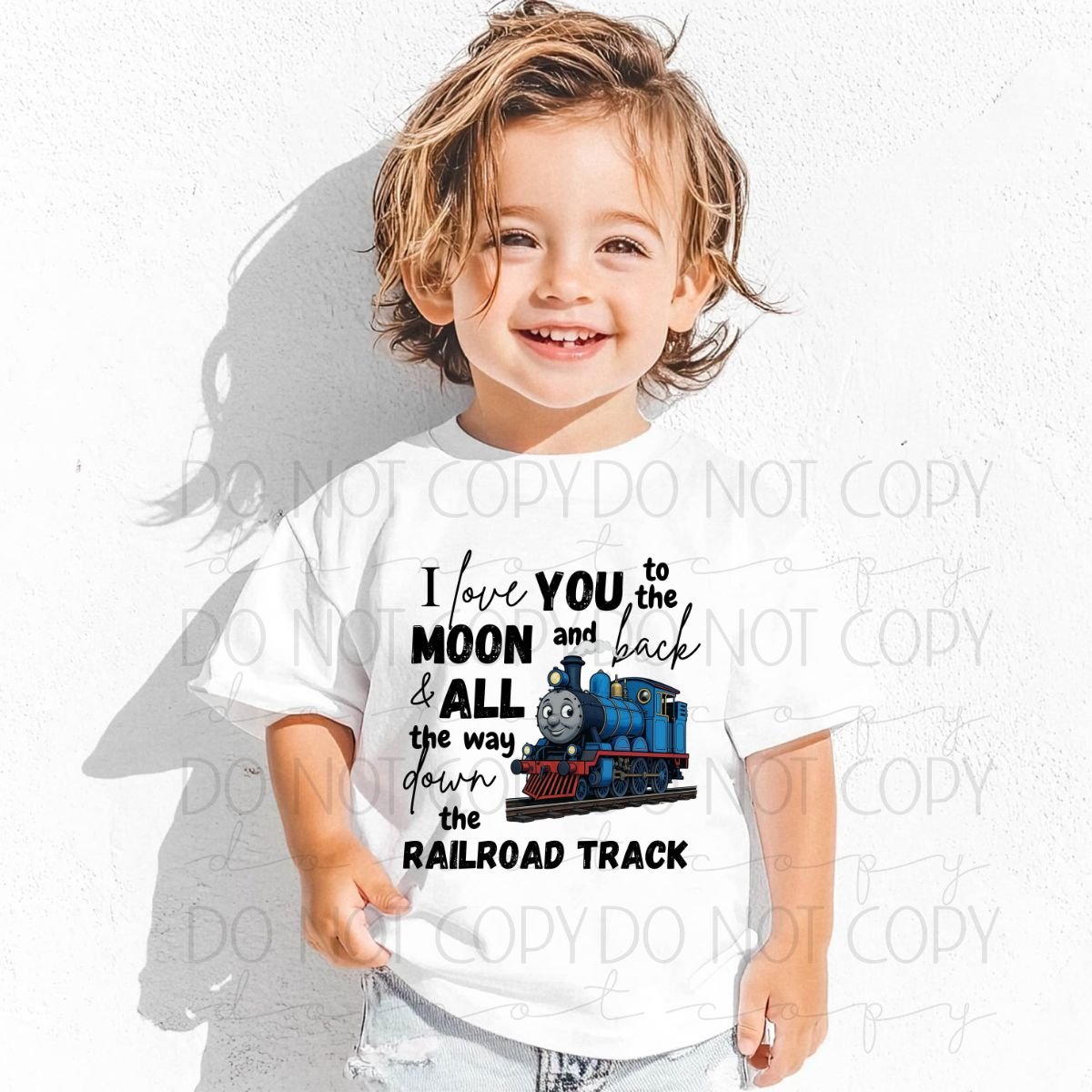 This high-resolution PNG design features a charming blue train and the heartfelt quote: βI love you to the moon and back and all the way down the railroad track.β Perfect for creating custom t-shirts, nursery prints, tumblers, or any project that needs a little extra love and whimsy.