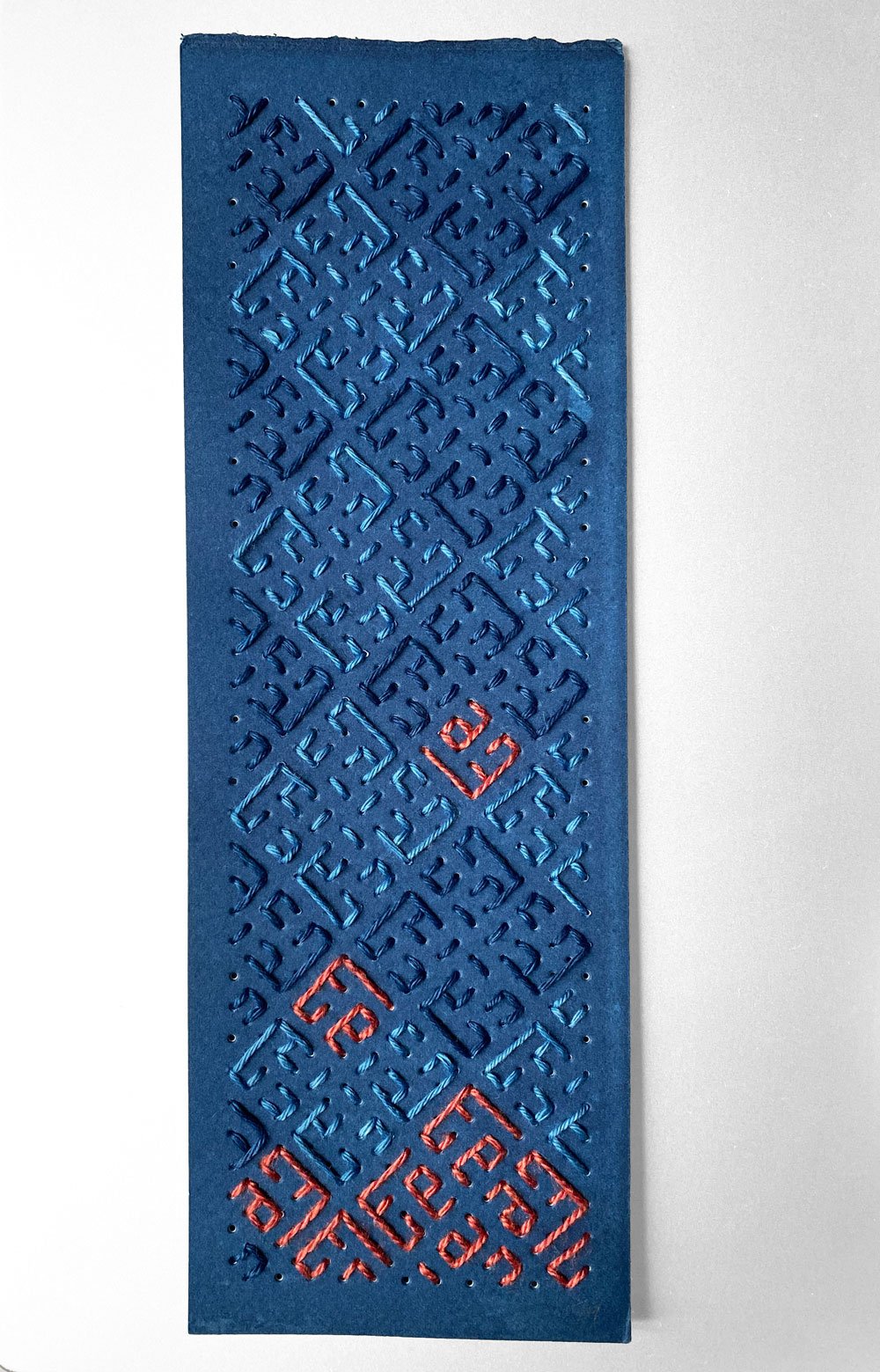 Indigo-dyed cotton thread and madder-dyed silk thread, stitched on indigo-dyed paper, 10x28 cm.