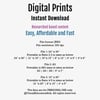 This print is a DIGITAL PRODUCT. No physical print will be delivered. You will be provided with a link to download the print file(s) immediately in your email once the purchase has been made successfully.