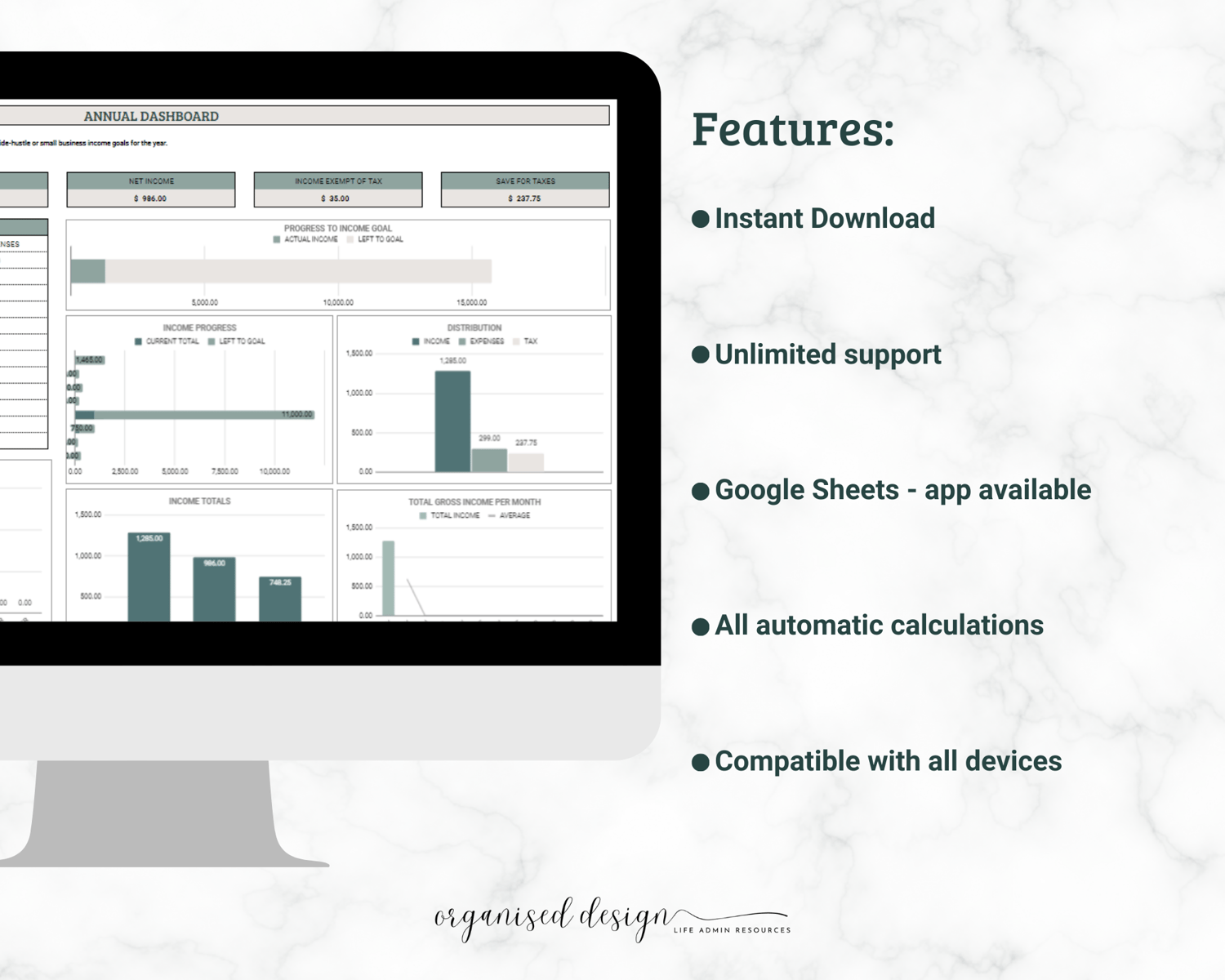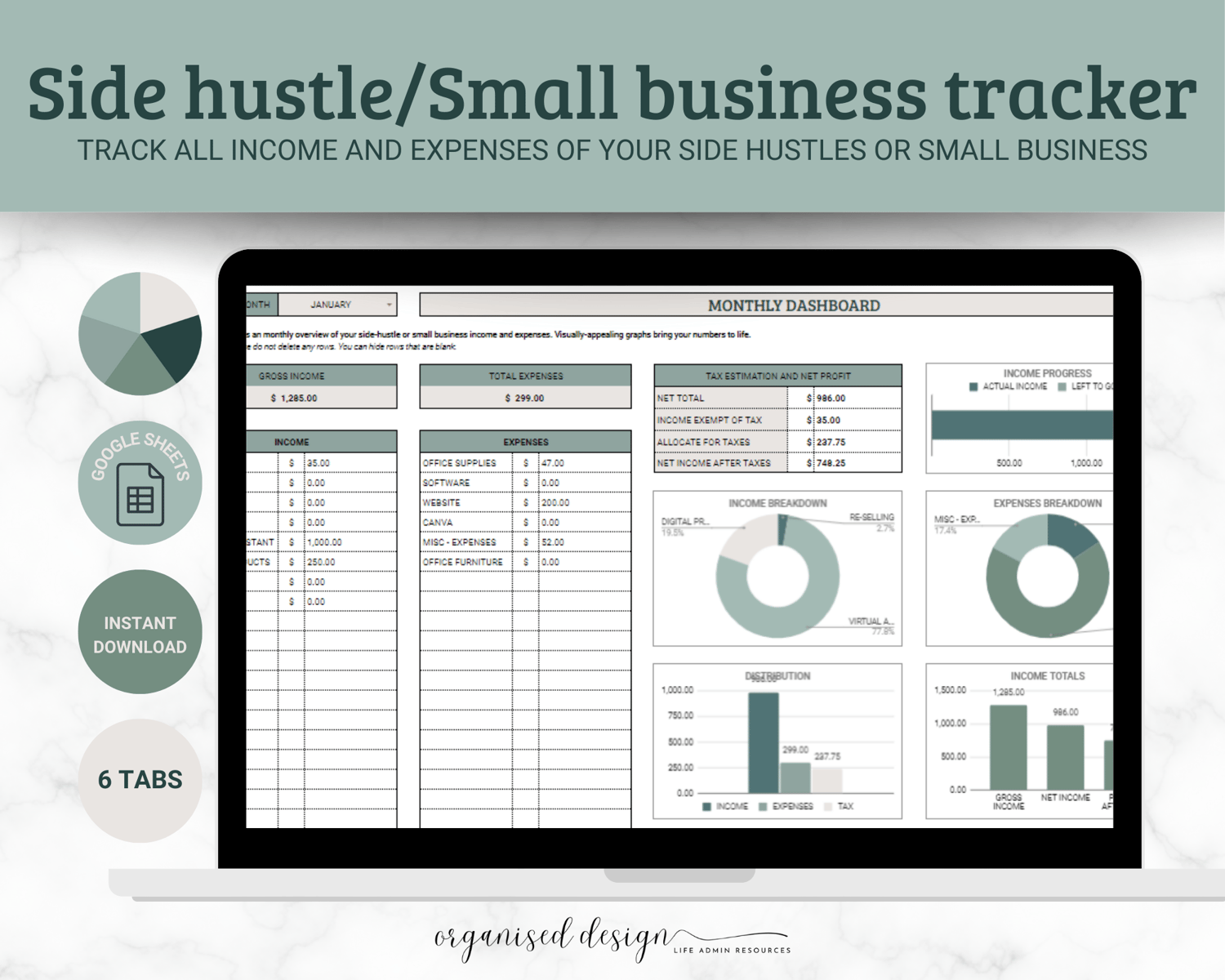 Congratulations on joining the crazy world of side-hustling or starting your own small business! This side-hustle and small business tracker is where you will track your income and expenses, ensuring tax time is a far more enjoyable process. Based on your data it will automatically generate graphs to visualise what you're profiting.
