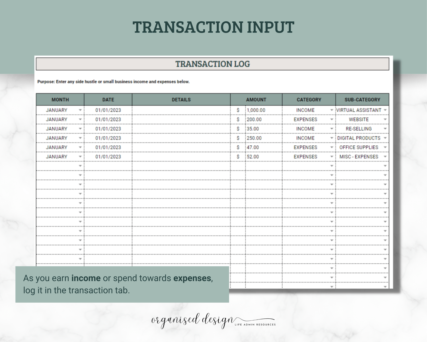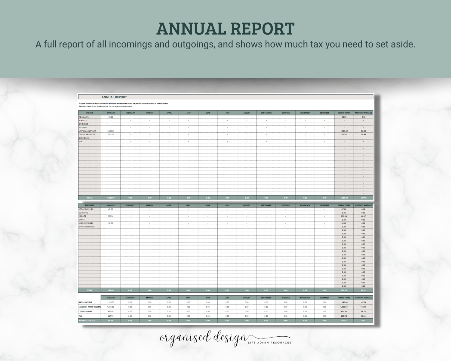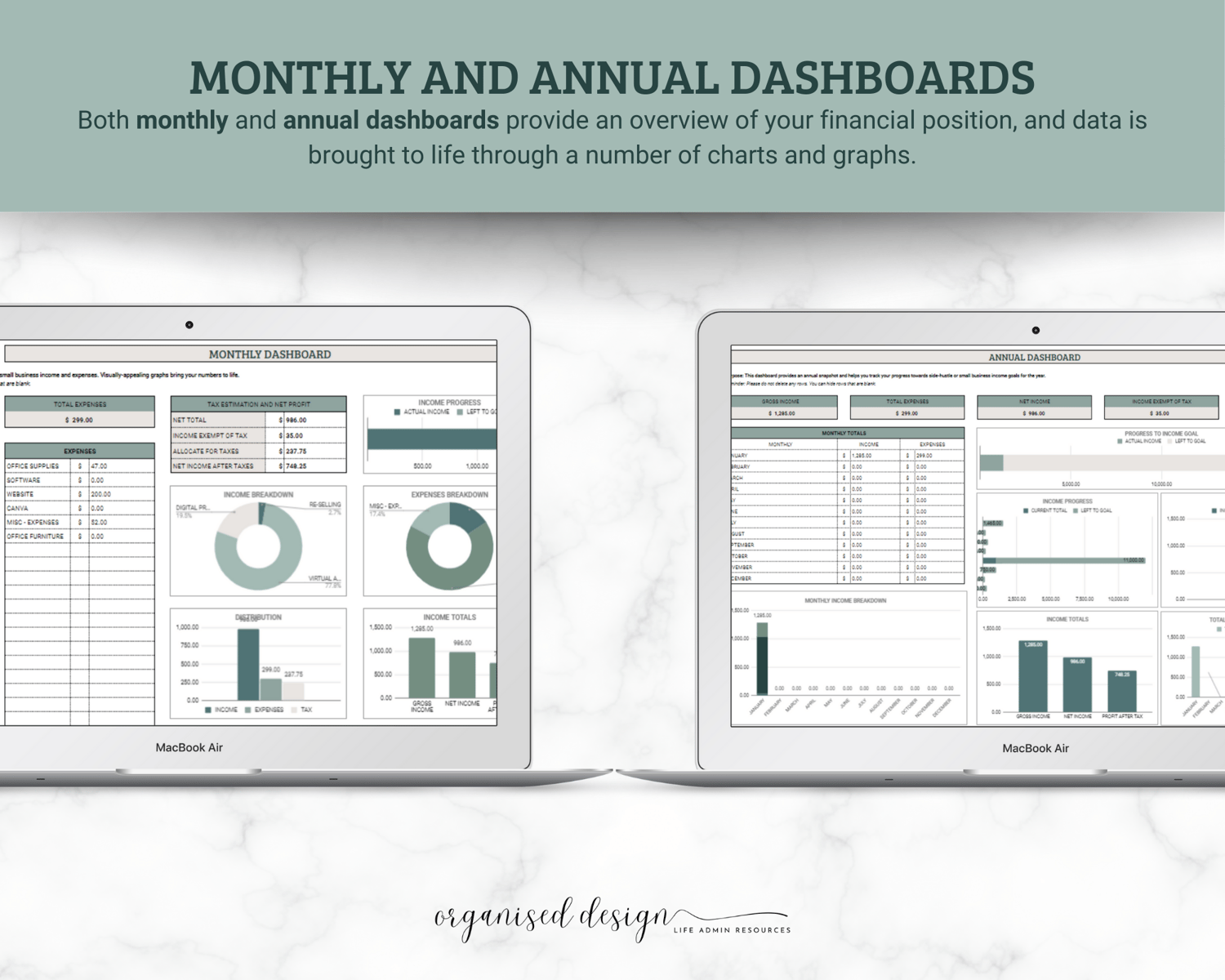 • 5 Spreadsheets + Instructions - Set-up, Transaction Log, Monthly and Annual Dashboards, Annual Report.