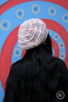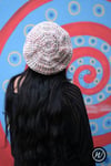 Striking rings of cables and lace eyelets adorn this sideways knit Hat. The pattern works itself all the way through the Hat, right into the crown, where the cables form ever decreasing circles.