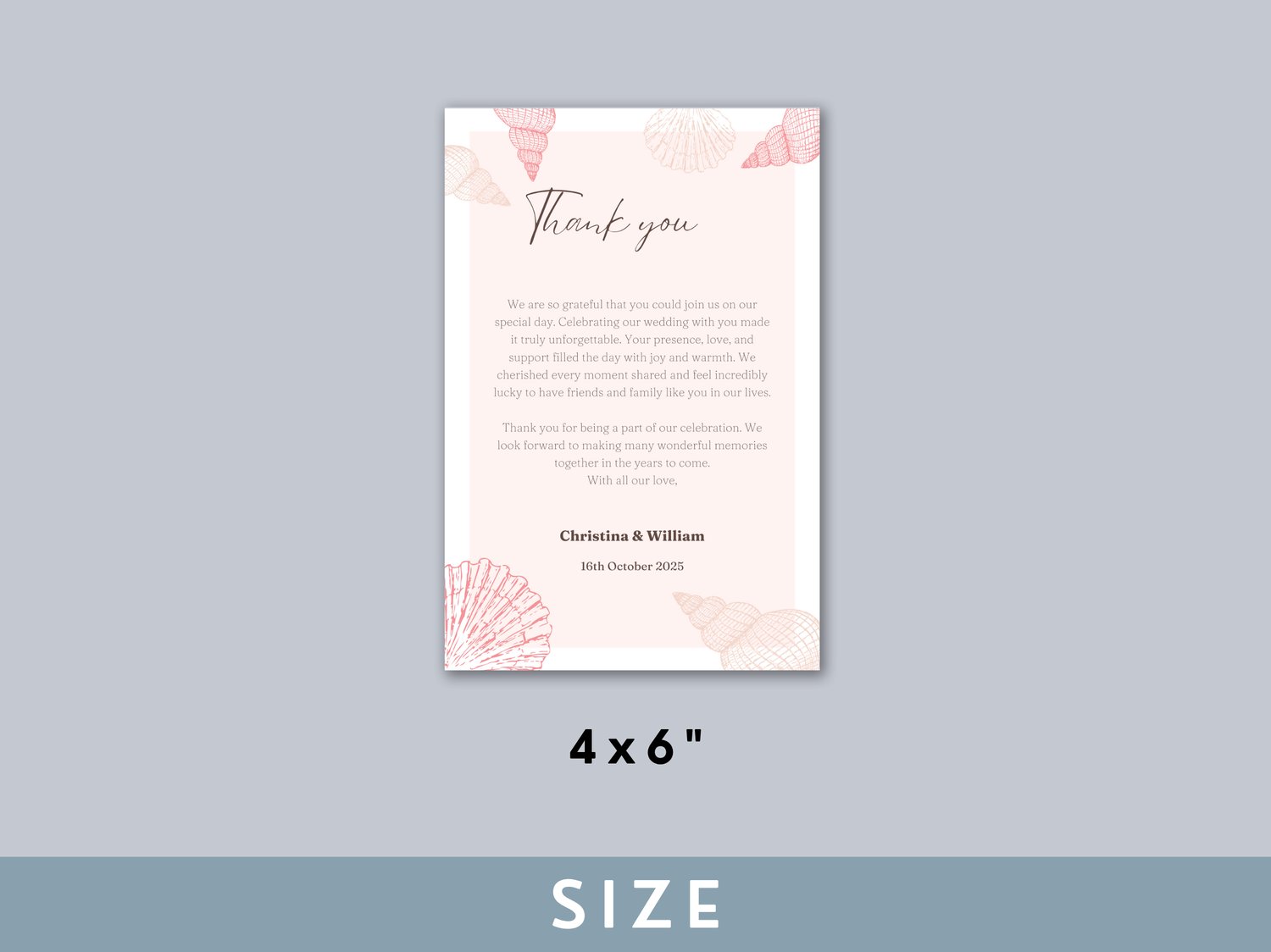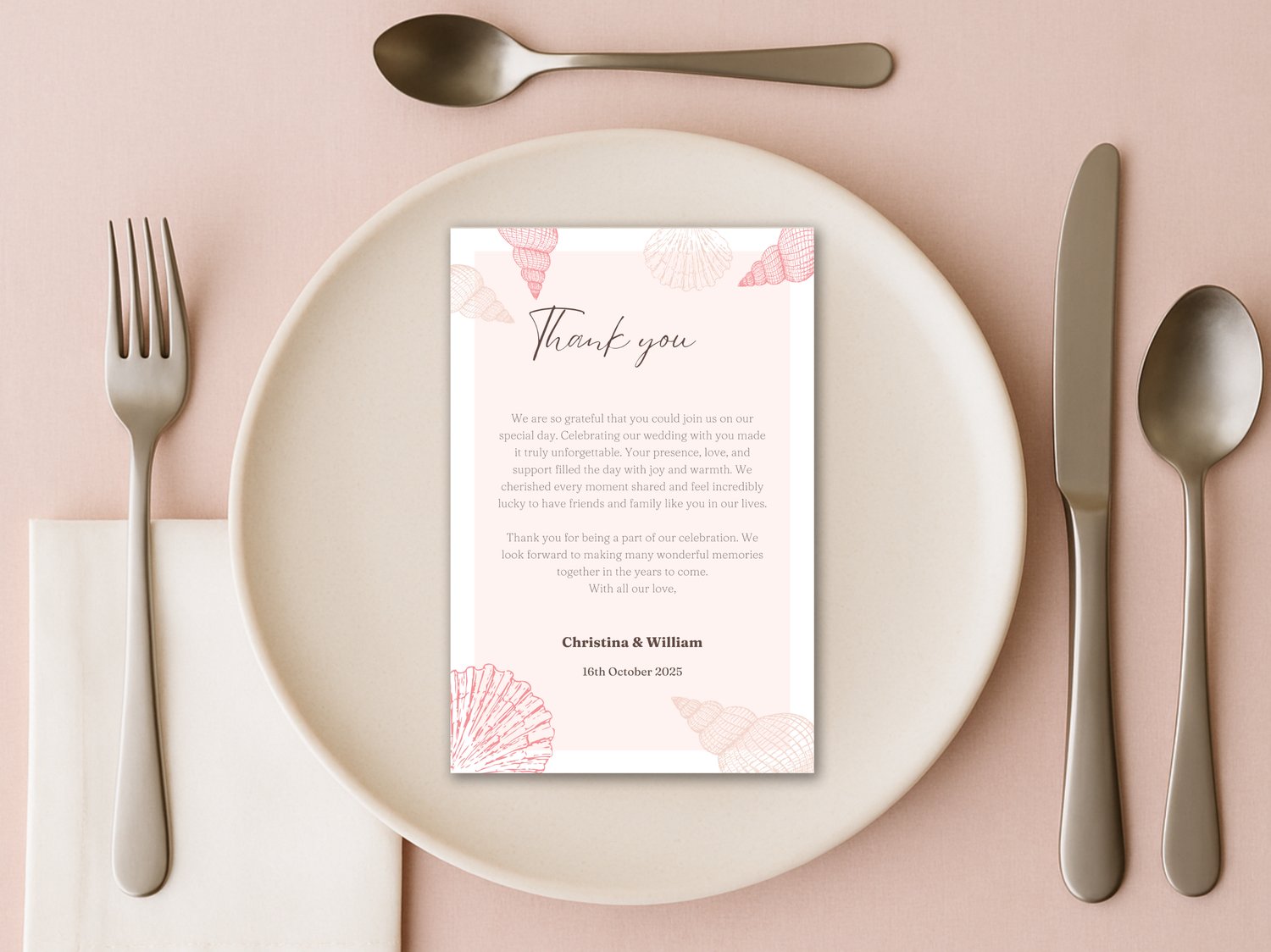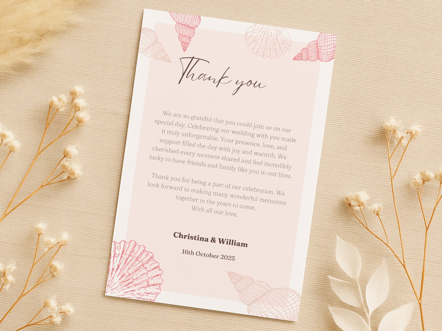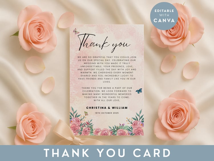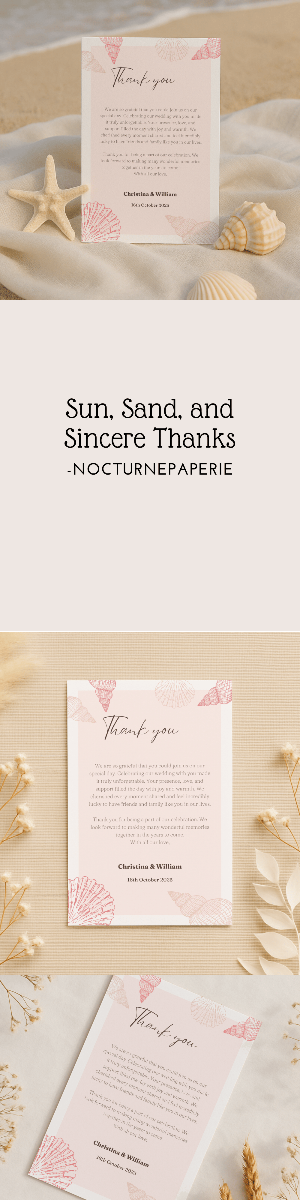 Bring coastal vibes to your big day with this beach wedding thank you card template in a tropical theme. The editable printable card is ideal for a guest message at a summer wedding. It’s part of our seasonal collection on NocturnePaperie—explore other seasons like Winter, Spring, and Autumn.