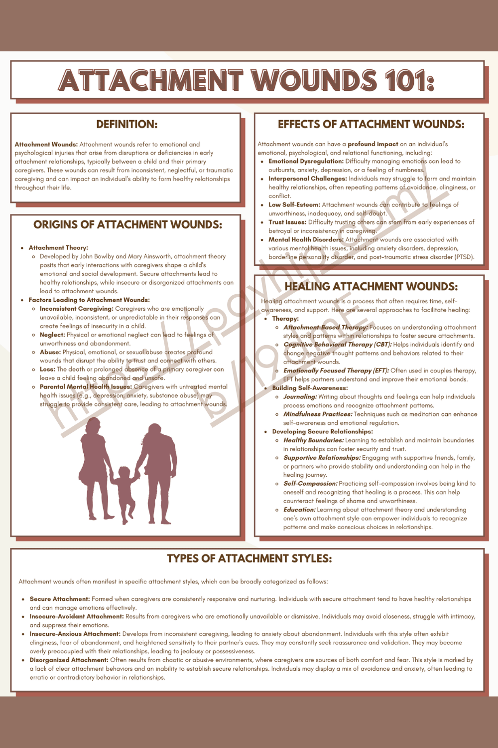 This worksheet provides a 101 overview on attachment wounds. Attachment wounds are significant emotional injuries that can affect individuals throughout their lives. Understanding the origins, types of attachment styles, and the effects of these wounds is crucial for fostering healing and personal growth.