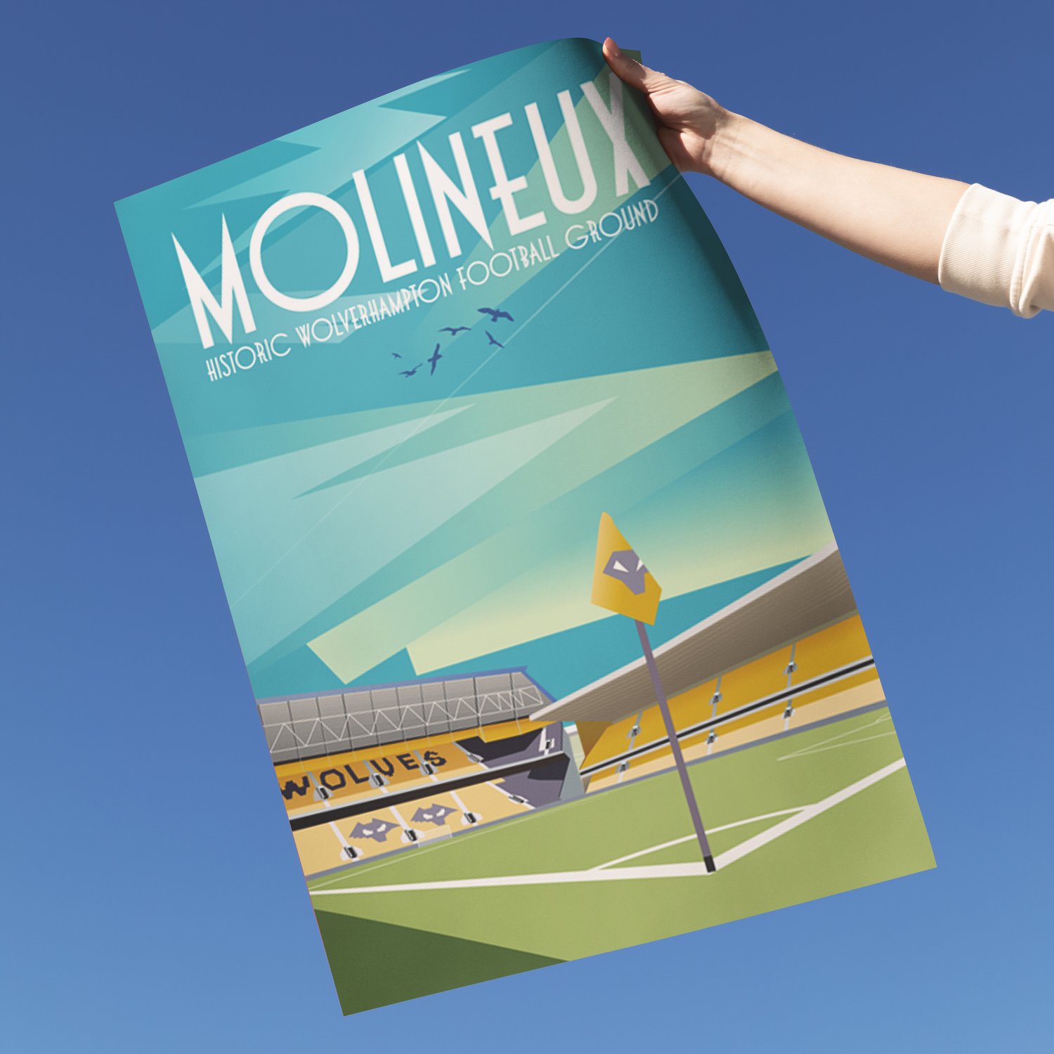 Celebrate the heart-pounding spirit of Wolverhampton Wanderers with this dynamic illustrated poster of the iconic Molineux — the historic Wolverhampton football ground! Perfect for fans, this digital wall art captures the stadium's legendary gold and black stands and electric matchday atmosphere in vivid retro style.