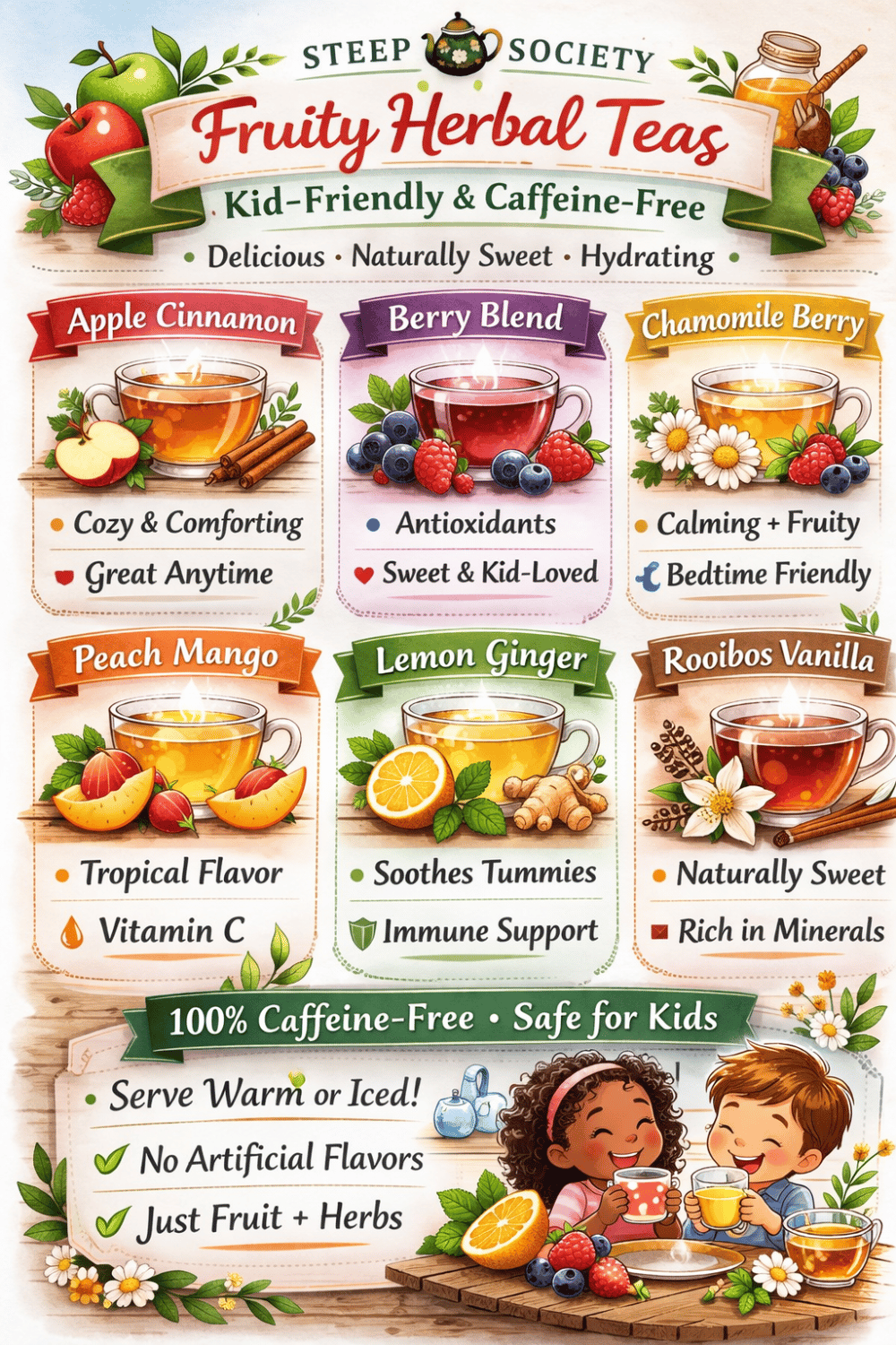 Teatime just got sweeter š This Steep Society infographic showcases fruity herbal teas kids love, including apple cinnamon, berry blends, peach mango, cherry vanilla, and fruit medleys. TheseĀ fun & flavorful picksĀ are naturally caffeine-free and perfect for warm or iced serving. If youāre exploringĀ kids' tea ideasĀ that feel exciting, yet safe, fruit-based herbal teas are a great place to start. Theyāre colorful, hydrating, and packed with kid-friendly flavor without the caffeine.