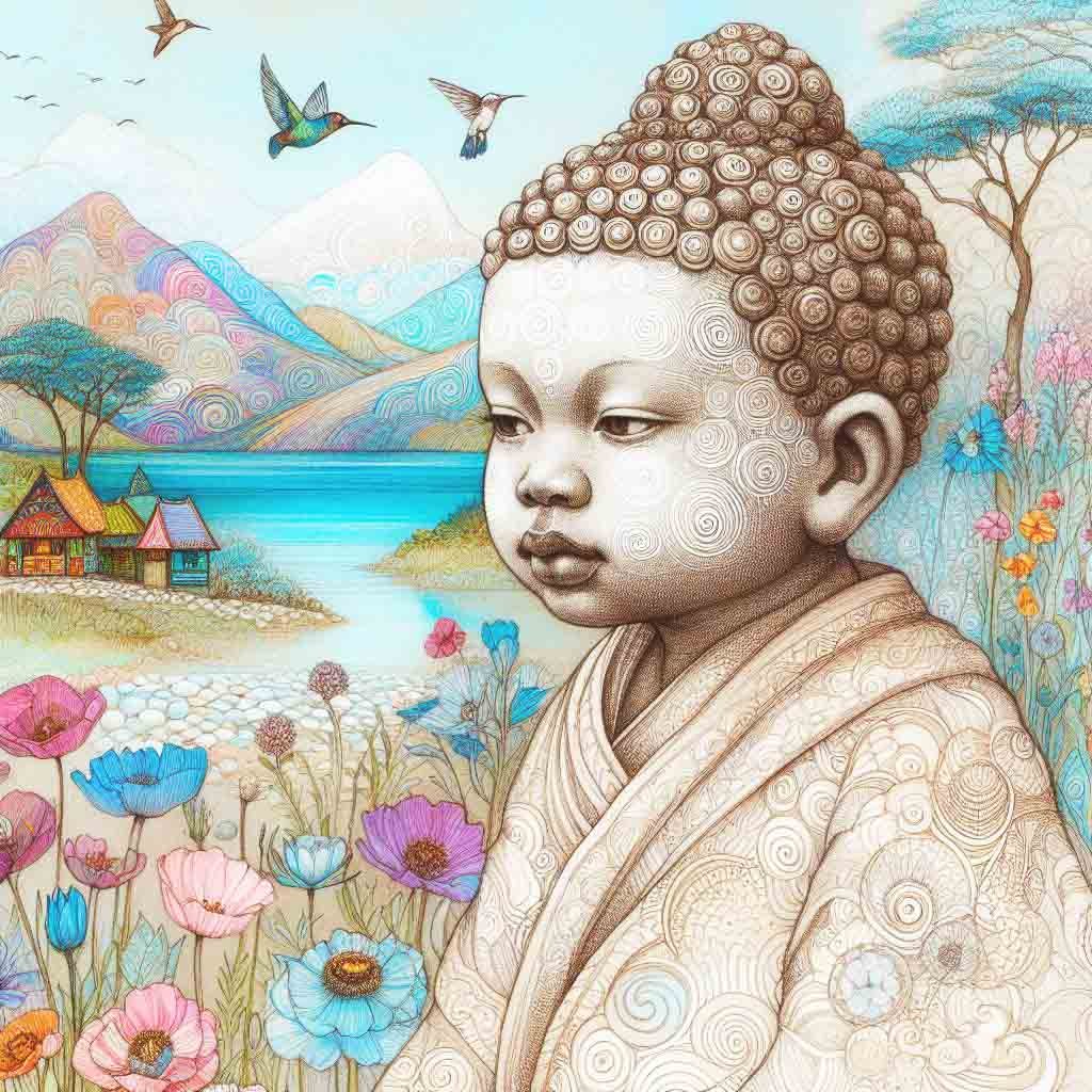 Beautiful child buddha with patterned mountains, a lake, flowers, trees & humming birds.
