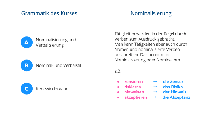 Book contents: - Business German - Studying in Germany - Grammar: Nominalisierung, Verbalisierung, Nominal- und Verbalstil, Redewiedergabe - Vocabulary: Universität, Wirtschaft, Business Deutsch, Technologie, Dialekt, Jugendsprache - German learning tips