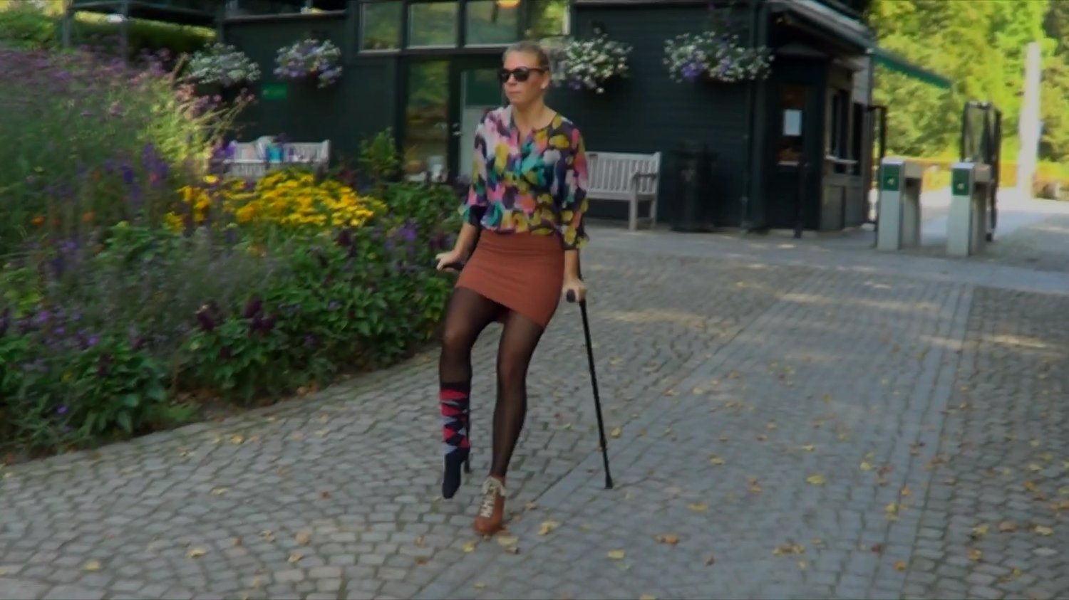 Tiiger is hopping out of her car dressed up in quite a hot outfit, she’s wearing a tight brown skirt together with her colourful blouse. Looking absolutely stunning in the sunshine. Tiiger grabs her crutches from the trunk and started to crutch towards a beautiful castle in a beautiful park, she came across a bench on her way and sits down for one quick rest. Obviously there’s a good opportunity to film a closeup of her sprained foot as she holds it out for the camera. Her long socks look’s so nice. A gentle massage of her foot in a closeup is the perfect ending of this clip.