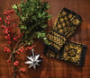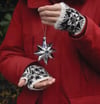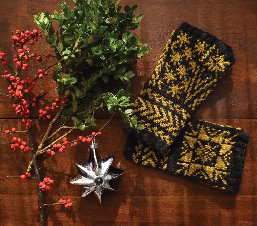 Vidar Half-Mitts are made using the two-color stranded knitting techniques and motifs found throughout Norway and traditionally used for mittens and gloves in Selbu, Norway. Vidar includes a men’s cuff, a star, a spider, spruce twigs, lightning and a spitball patterned palm. Many thanks to Anne Bårdsgård for her book, Selbu Mittens, published by Trafalgar Square Books of North Pomfret, Vermont. Pattern requires the following skills: working in the round in small circumferences, increasing and decreasing, stranded knitting in two colors.