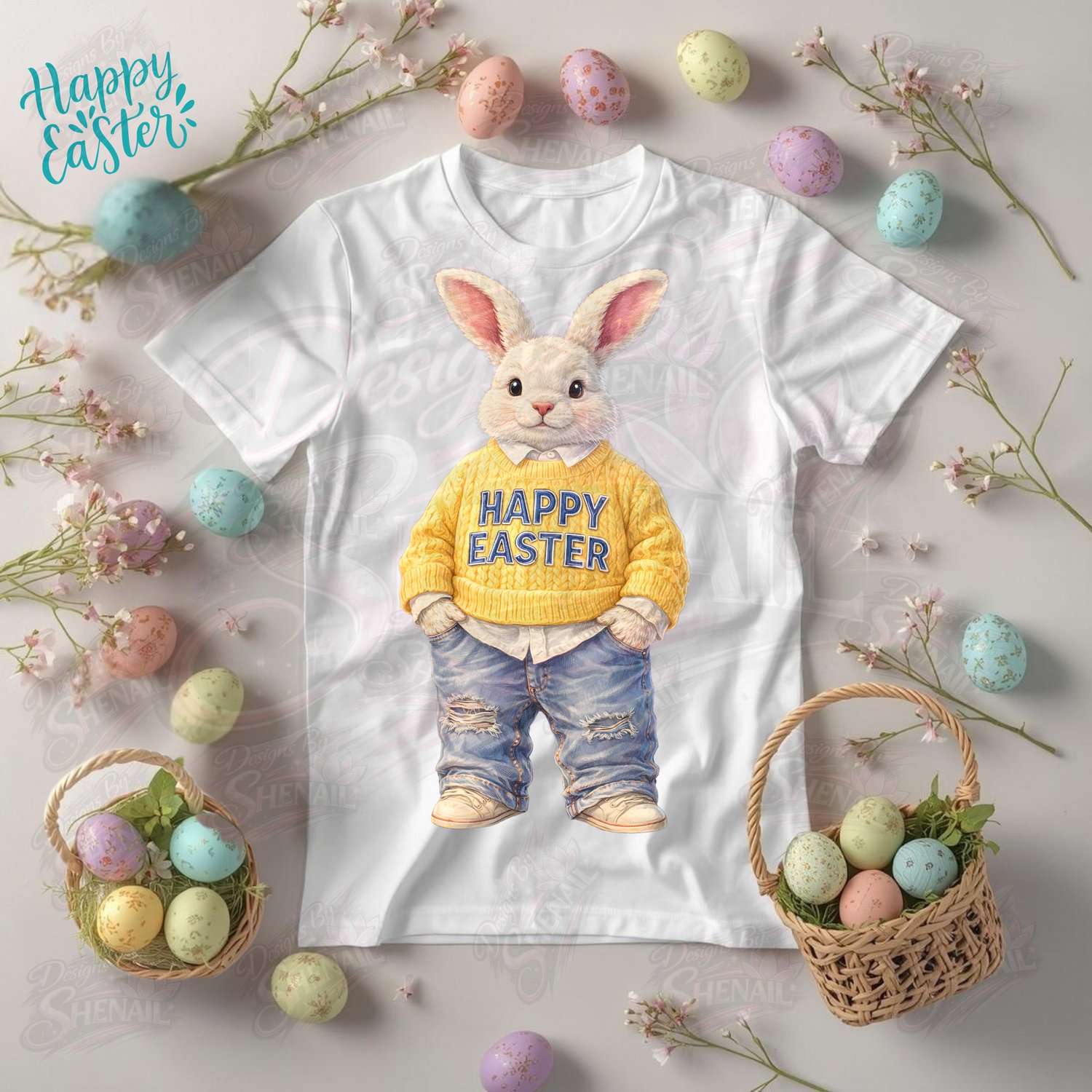Add a sweet and stylish touch to your Easter creations with this Happy Easter bunny design. Featuring an adorable bunny wearing a cozy yellow sweater, trendy ripped jeans, and sneakers, this graphic brings a modern boutique vibe to your Easter projects.
