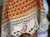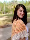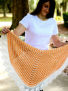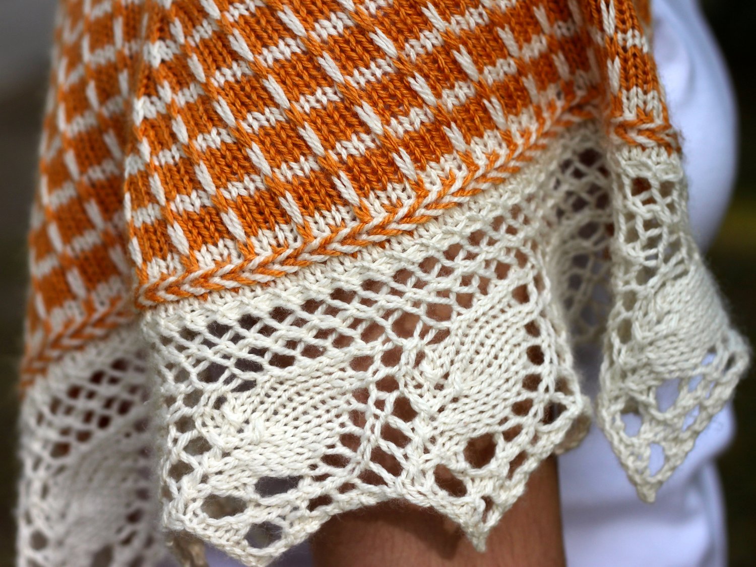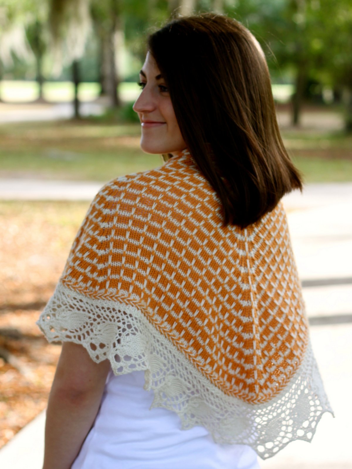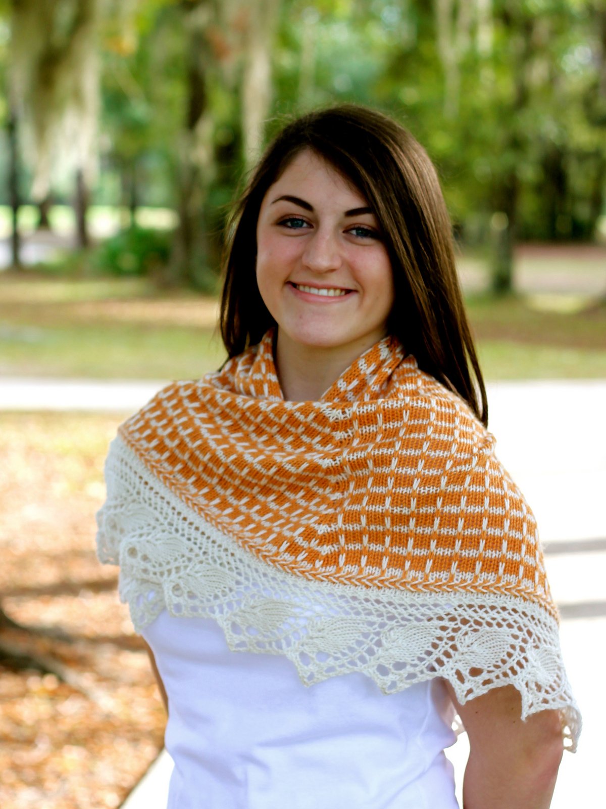 Lareina begins with a fancy lace border in a classic creme. sts are picked up to work a Latvian Braid before continuing with a striped, slip stitch body. The creamsicle colors of Yellowstone’s silk/wool blend makes for a sumptuously soft shoulder wrap that works in all seasons. The lace border is worked first and sts are picked up to work the Latvian braid. The body of the shawl is worked in stripes and then the remaining sts are grafted together. All slip sts are worked with the yarn to the wrong side of the work. Lareina is the second striped Yellowstone shawl in the Perfectly Placed e-book collection.