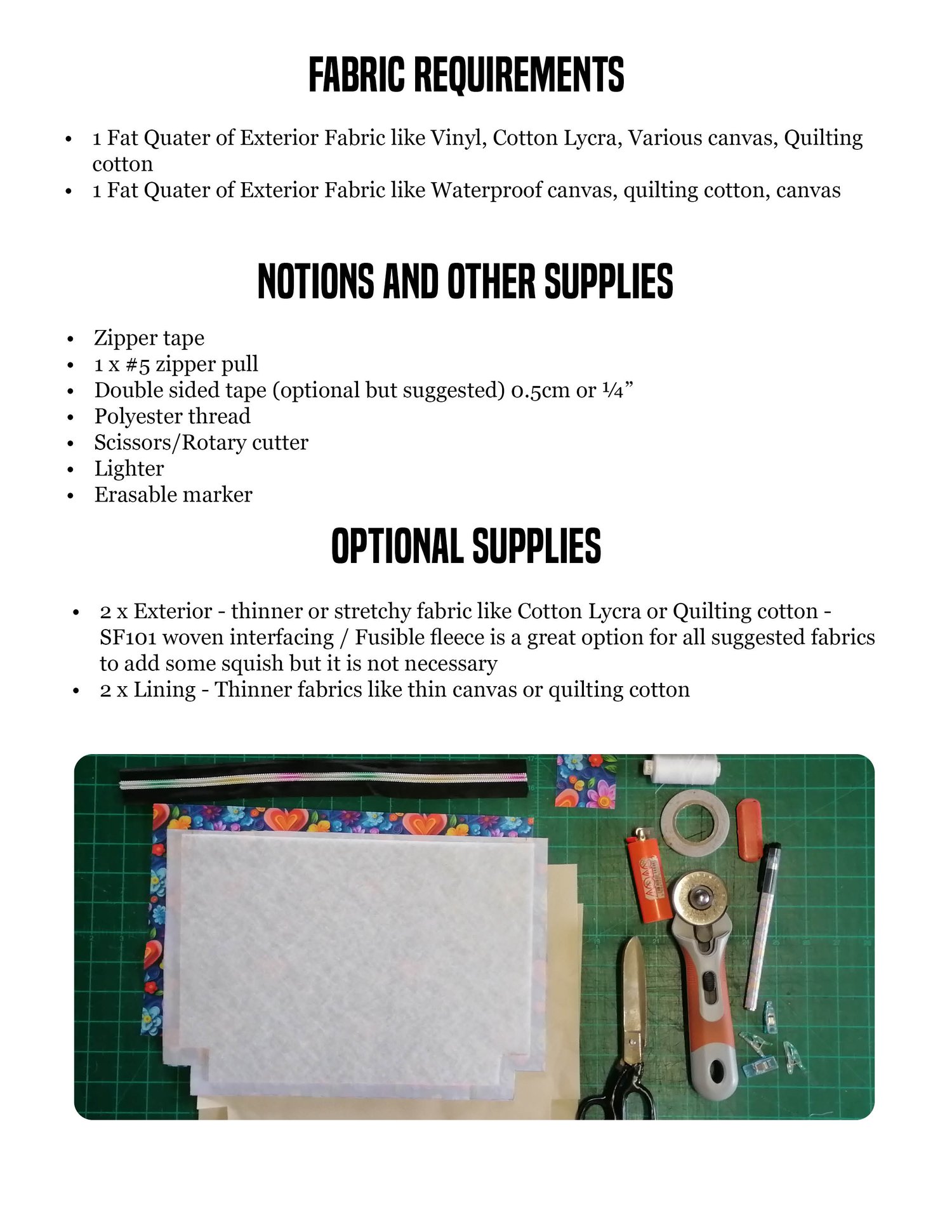 - 2 x Exterior - thinner or stretchy fabric like Cotton Lycra or Quilting cotton - SF101 woven interfacing / Fusible fleece is a great option for all suggested fabrics to add some squish but it is not necessary