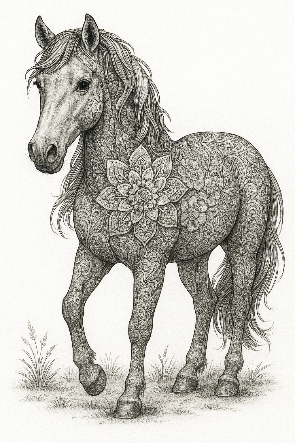 Mandala Horse – Intricate Floral Coloring Page for Mindfulness & Calm