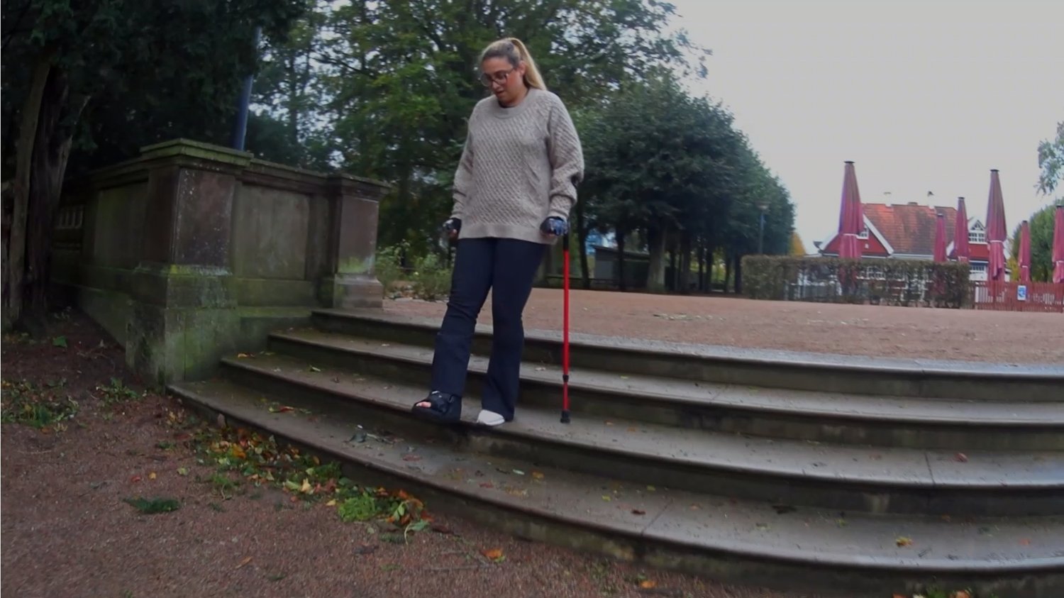 Today is not a normal day, because today we get to tag along together with Penelope on her walk with the crutches, as her right foot is injured, Penelope is therefore wearing an Canwalker when she enjoys the park. She is having so much fun today cracking jokes, that sometimes- she’s laughing way too much and can barely keep on crutching. Watch as she struggles to take herself up against a few steps of stairs as she burst out in laughter and can’t seem to stop herself. Hot closeups of her bare toes is captured. Enjoy!