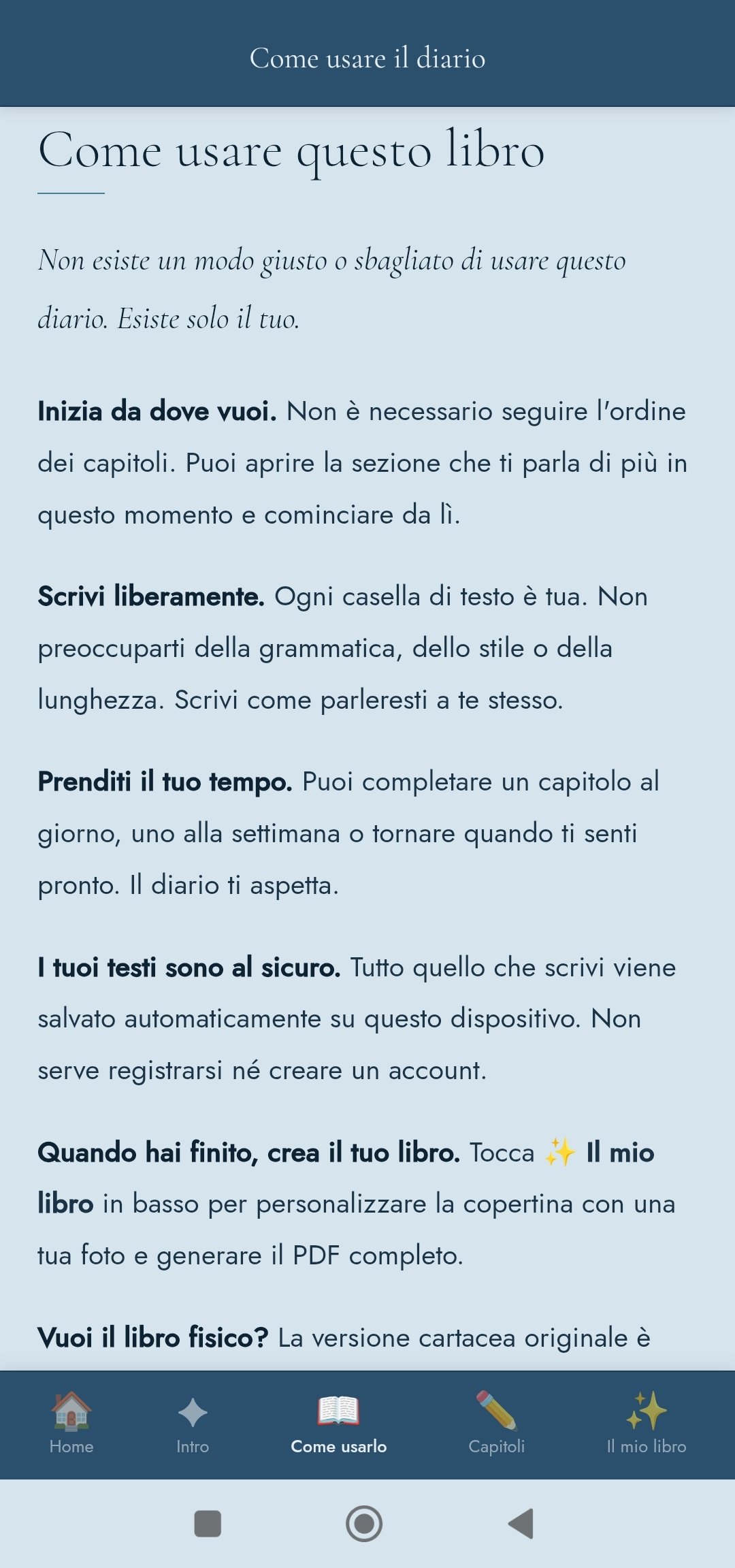 Se utilizzi la versione digitale su telefono, i tuoi scritti saranno presenti solo su quel telefono e in quel browser. Cambiando dispositivo o browser, o cancellando la cache, i dati non saranno più recuperabili. Ti consigliamo di esportare il tuo diario in PDF periodicamente usando la funzione integrata nel prodotto.