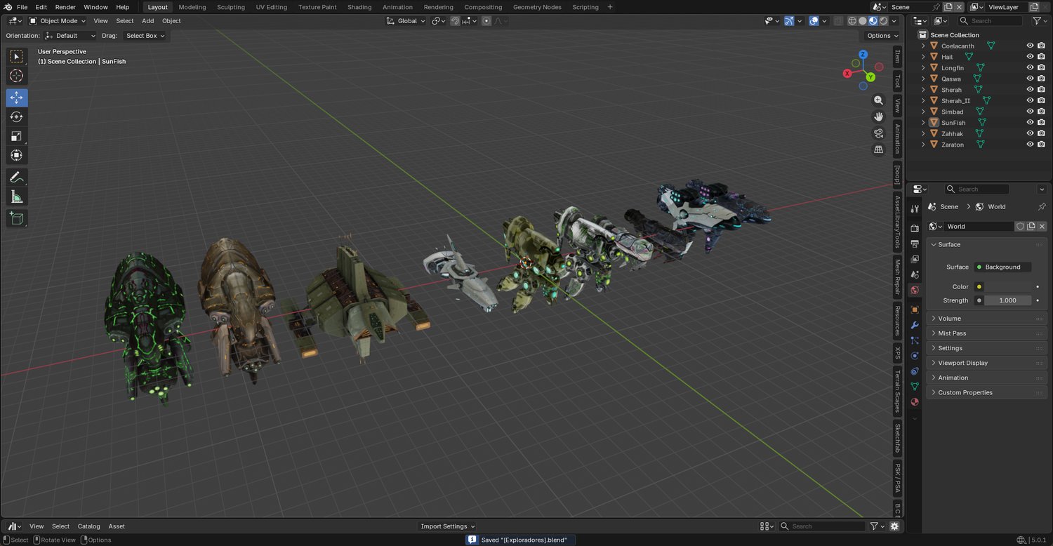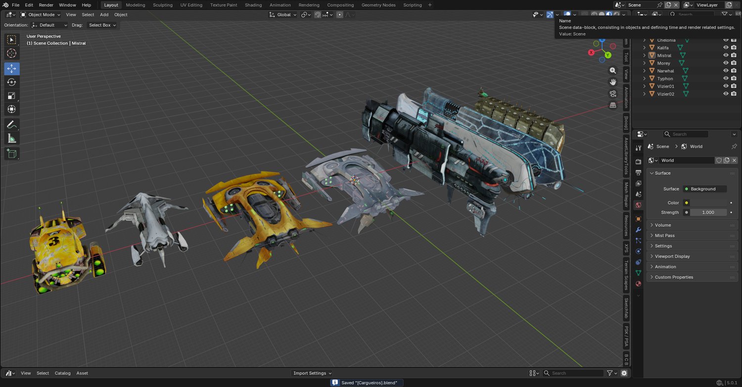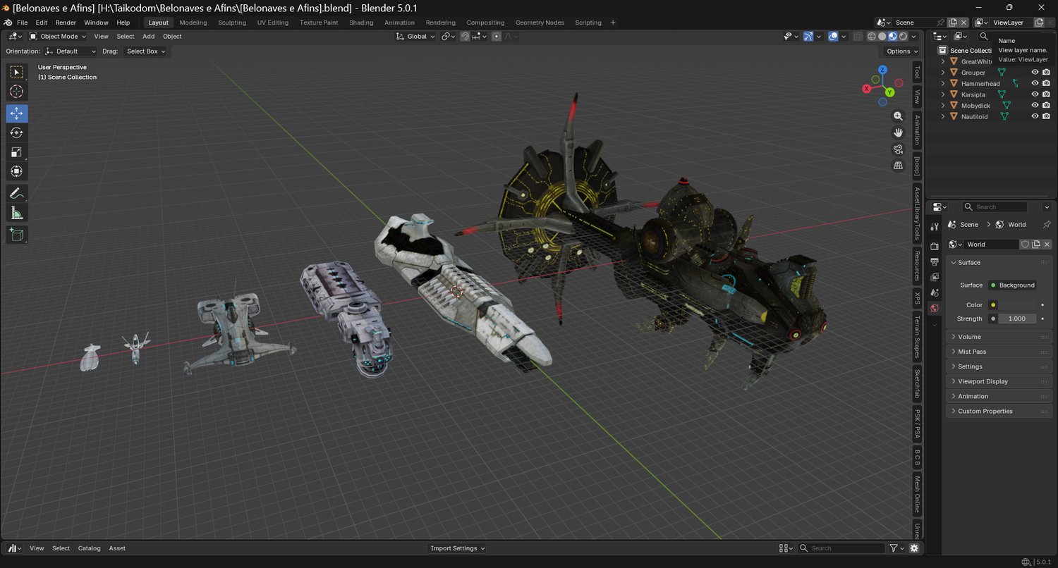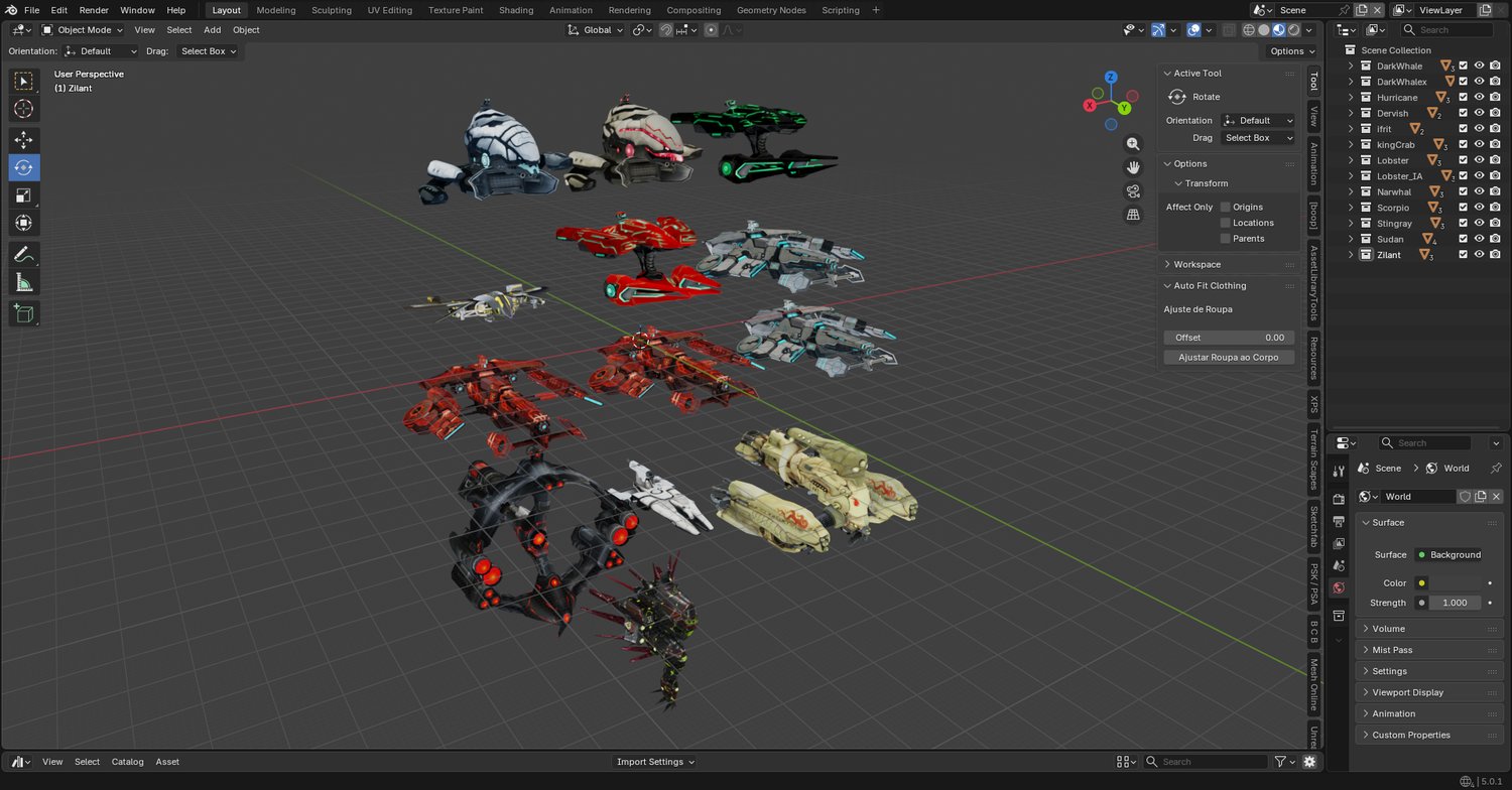 Pack de assets 3D de naves espaciais sci-fi, convertidos e adaptados para uso em renders, cenas e animações no Blender.