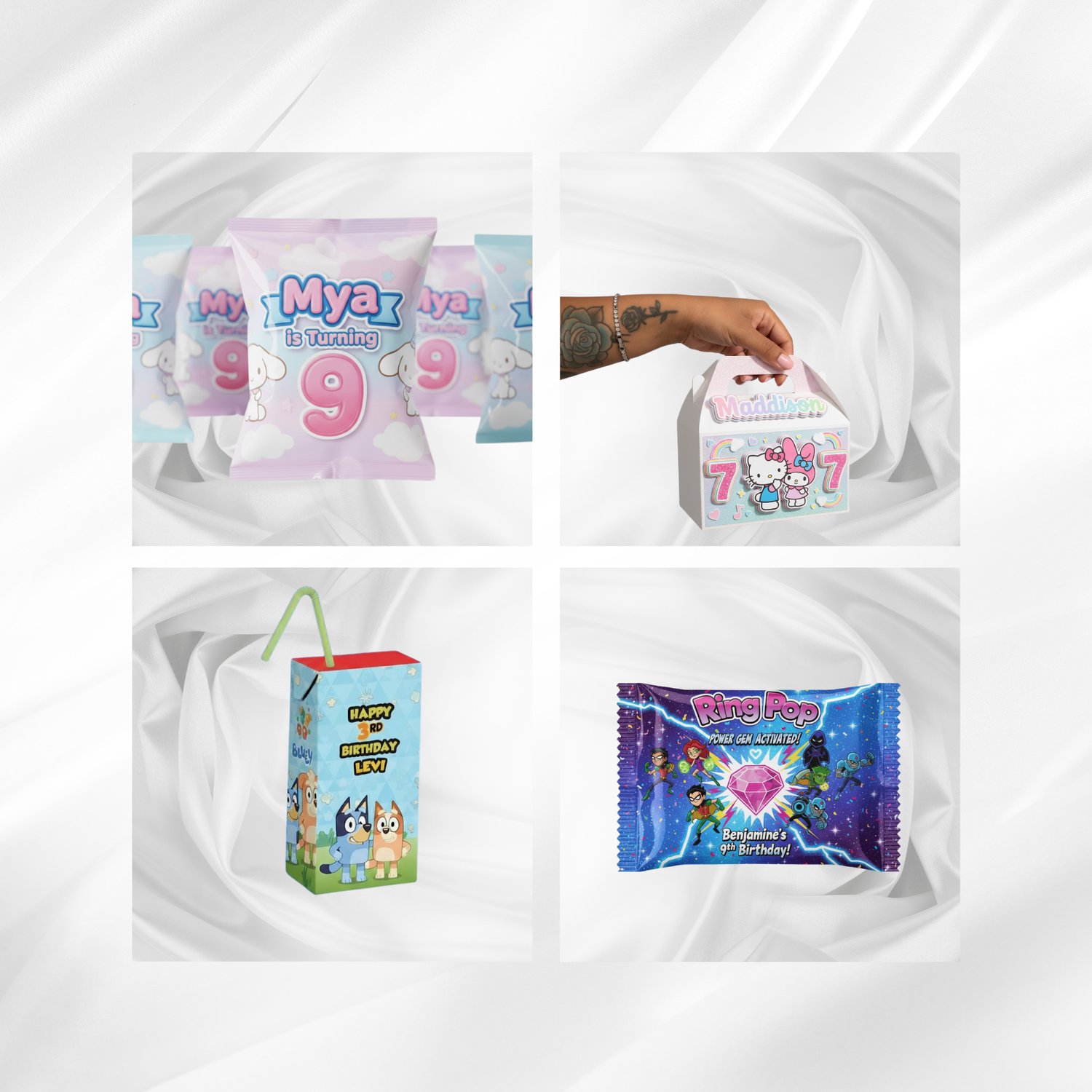 Mix and match your party favorites — chip bags, candy tubes, rice krispie treats, juice labels, bubbles, and more!