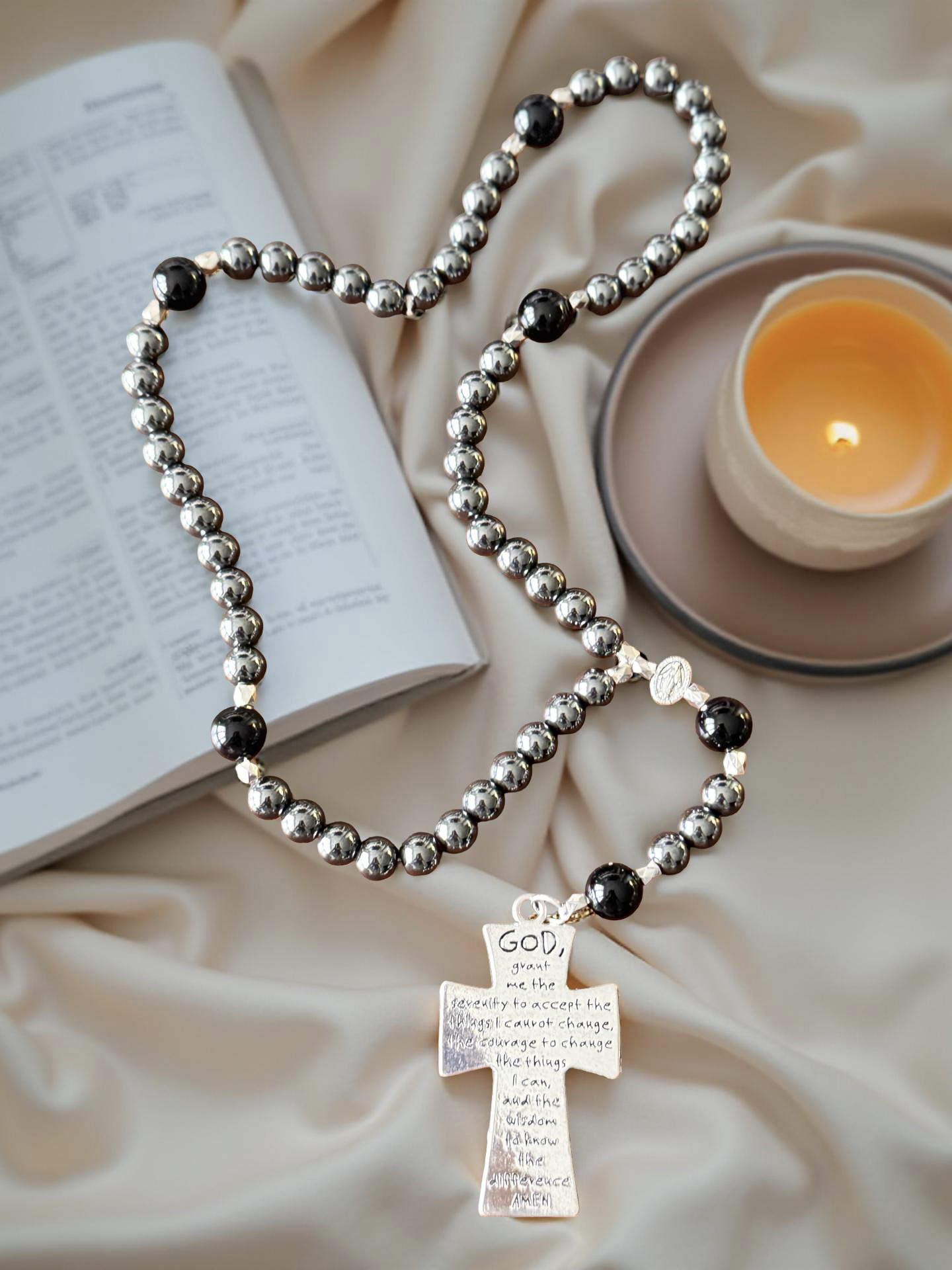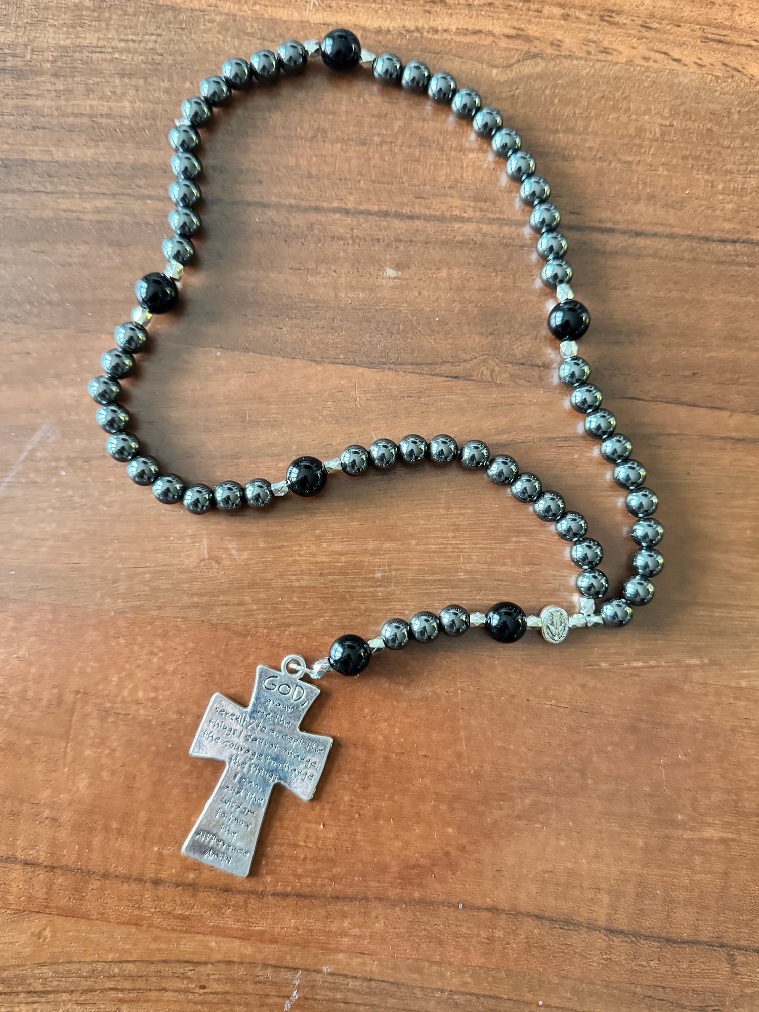 This exceptional men's rosary combines the powerful grounding energy of hematite with the deep strength of onyx, creating a devotional piece that commands respect. Handcrafted with premium natural stones and featuring a striking silver-burned cross, this rosary is designed for men who carry their faith with unwavering conviction and masculine dignity.