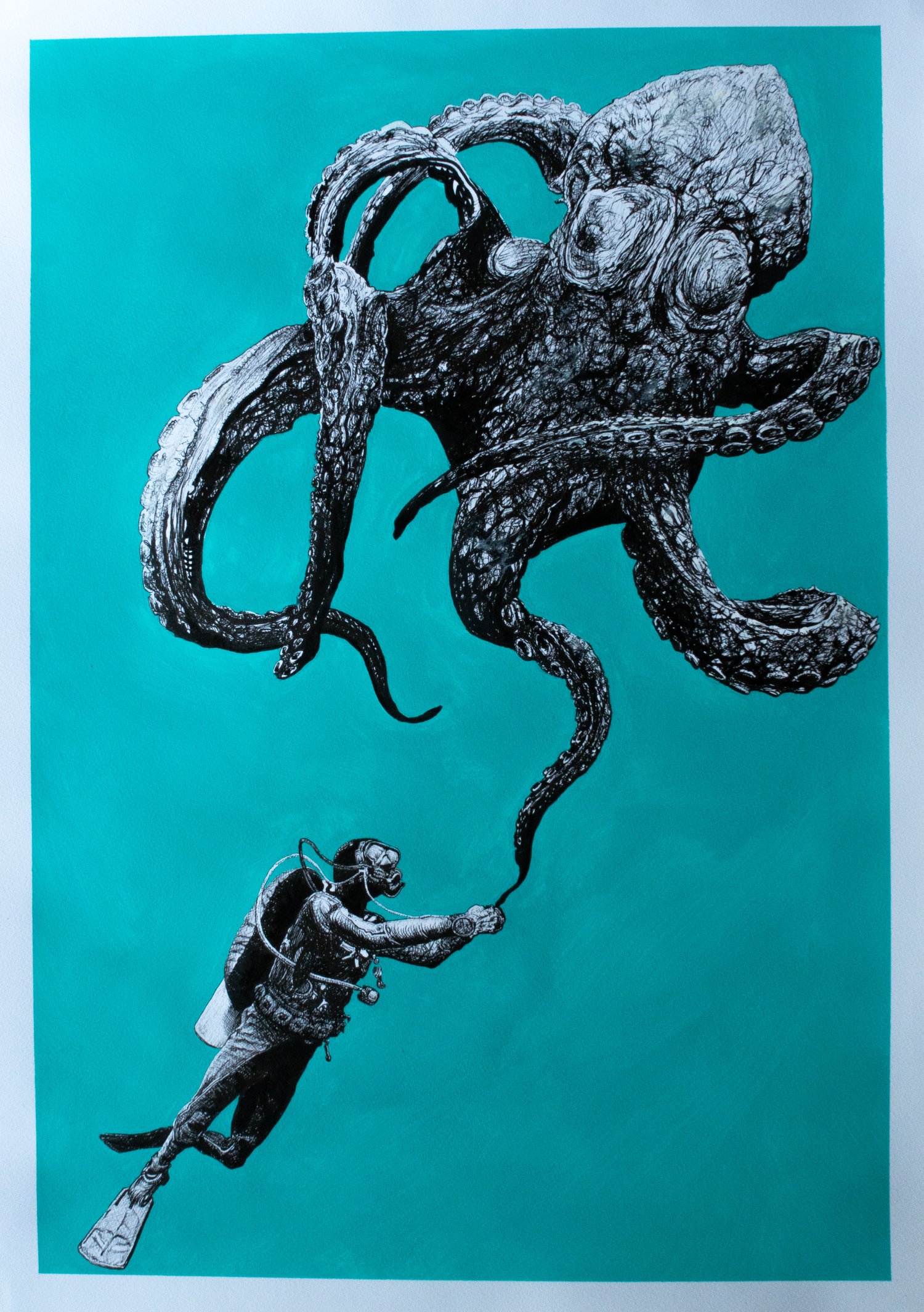 High-quality print of the painting "Octopus friend" completed in Berlin during the 2020-2021 period after watching the documentary "My octopus teacher", which really hit me. The original piece was completed with ink liners and acrylic on paper.