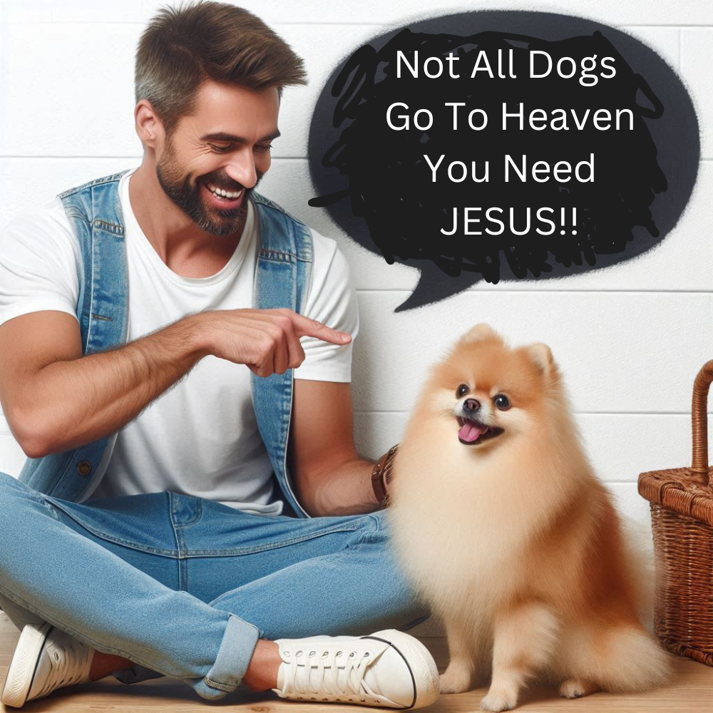 A man being funny by telling his dog he isn't going to heaven because he needs to accept Jesus first. "Not all dogs go to heaven, You need Jesus!!" You get this as a downloadable 2000 x 2000 pixel printable PDF file.