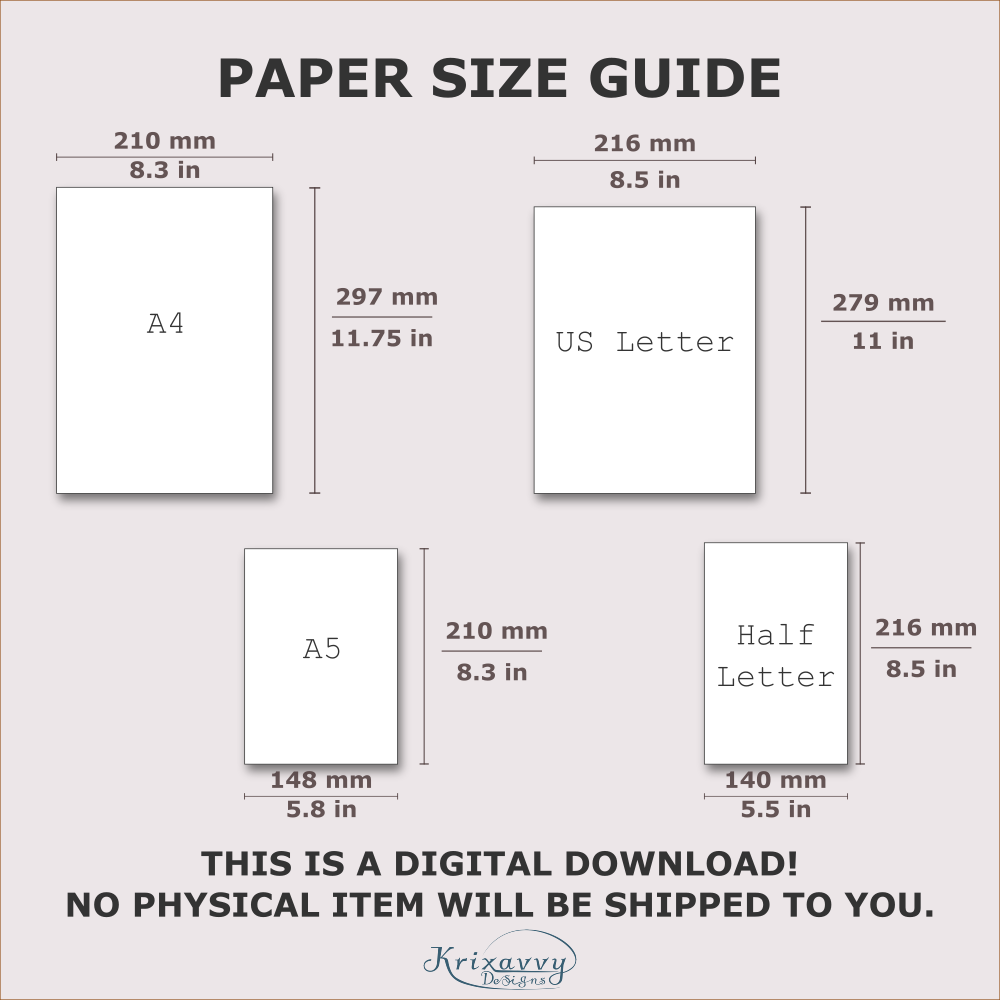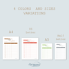You will receive 4 ZIP Files (A4, Letter size (US), A5 and Half Letter); each ZIP file contains 4 PDF Files (Pink, Blue, Brown and Green color)