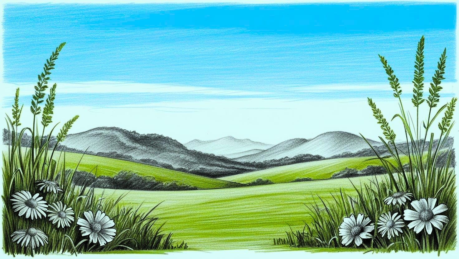 "Whispers of the Wind" captures a serene and ethereal moment where nature speaks in subtle tones. The sketch portrays a windswept landscape, with delicate trees gently bending under the breeze, their leaves fluttering as if carrying soft messages from the sky. The flowing lines and curves of the wind are suggested through sweeping strokes that interact with the natural elements, such as grass, flowers, and distant hills, all caught in the quiet hum of the wind.