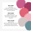 + Detailed Hex Codes, RGB, and CMYK values for each color