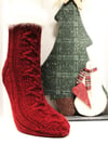 About Sizing: These socks are written for Baby Cashmerino which works up to 6 sts per inch on US size 4 (3.5 mm) needles. So with the cables, the circumferences of the socks run about 7.5 (8.5, 10, 11) inches. The larger stitch counts are offered so that the sock can easily be converted to fingering or sport-weight yarn. So if you choose a lighter weight yarn go with a stitch count that has worked for you in the past, keeping in mind that the cables snug things up a bit.