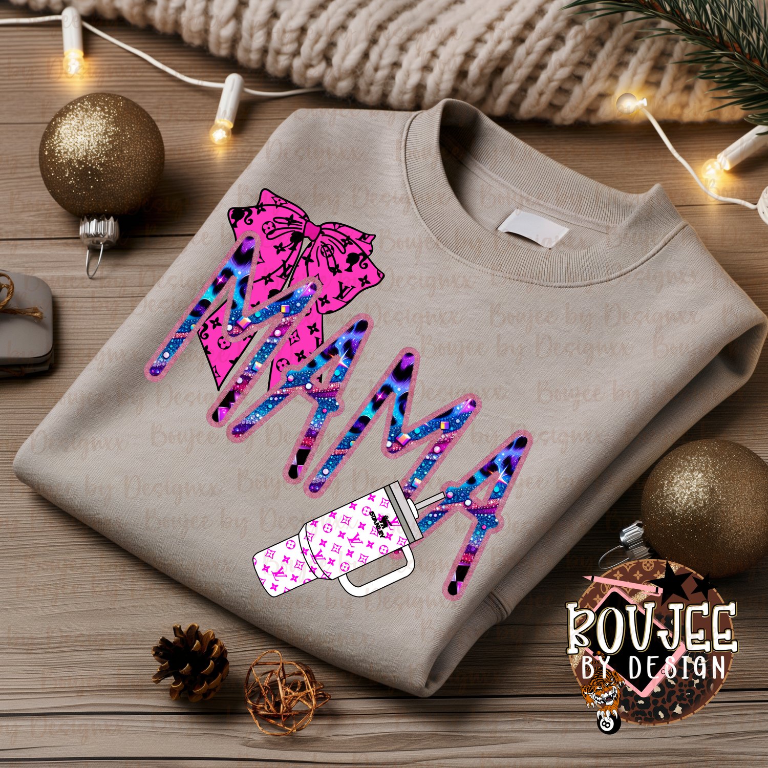 Pink & Blue Sparkle MAMA PNG | Bow & Tumbler Design | Boujee Coffee Mom Sublimation & DTF File