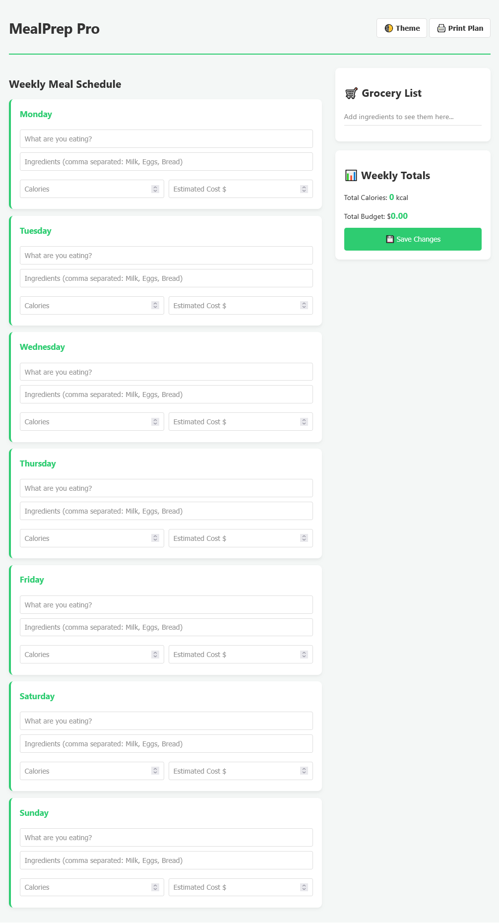 Take control of your nutrition, budget, and weekly organization with this powerful Meal Planner — a sleek, lightweight planning tool designed for real-world daily use. Built with a modern user interface, the planner features an instant Light / Dark Theme switch, allowing you to customize your workspace for comfort during day or night use. The intuitive Weekly Planner layout lets you quickly input meals for each day, creating a clear, structured overview that simplifies decision-making and reduces last-minute food stress.