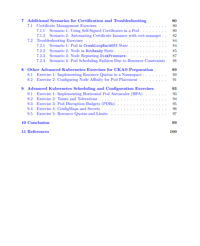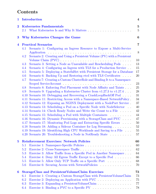 - 20+ Practical Scenarios : Ingress, Persistent Volumes, StatefulSets, TLS, custom roles, node affinity, cluster upgrades, debugging, and more