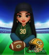 Bring your digital designs to life with this high-quality Chibi Sports Girl PNG, perfect for fans of the Green Bay Packers! This cute, cartoon-style illustration features a stylish girl with long dark hair, lush eyelashes, bold red lipstick, and dark brown eyes. She’s dressed in a forest green hoodie with the number “30,” a navy blue cap, and bright blue jeans. Sitting cross-legged with a Packers football and helmet in front of her, she’s the perfect blend of sporty and adorable.