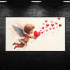 Features a dynamic blend of pink and red watercolor accents with a delicate cupid motif and abstract heart elements