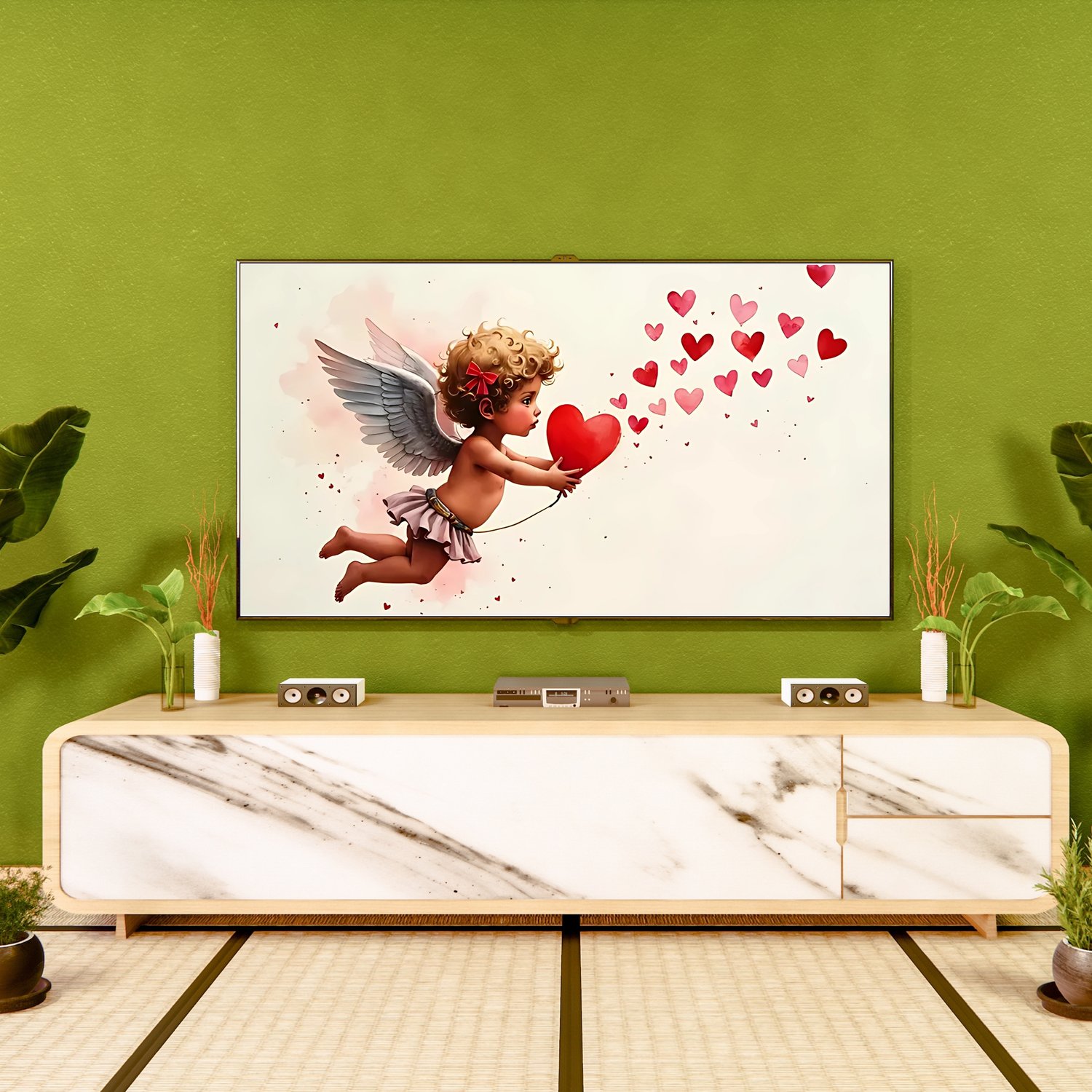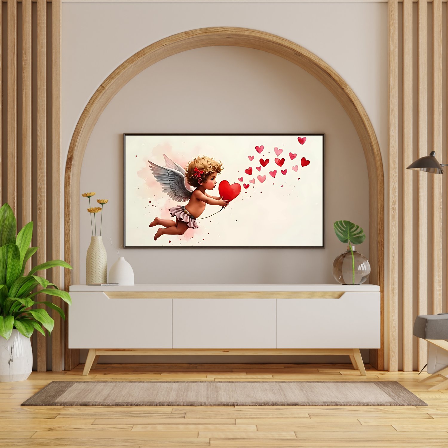 Transform your digital display into a romantic masterpiece with our exclusive Valentine's Day Frame Tv Art! This high-resolution digital download features a stunning blend of pink and red watercolor paint, elegantly capturing a cupid motif alongside abstract Valentine's red hearts. Designed especially for frame TVs—including Samsung Frame TVs—this artwork combines a textured, artistic finish with a modern twist, perfect for elevating your home or office decor this Valentine's Day and beyond.
