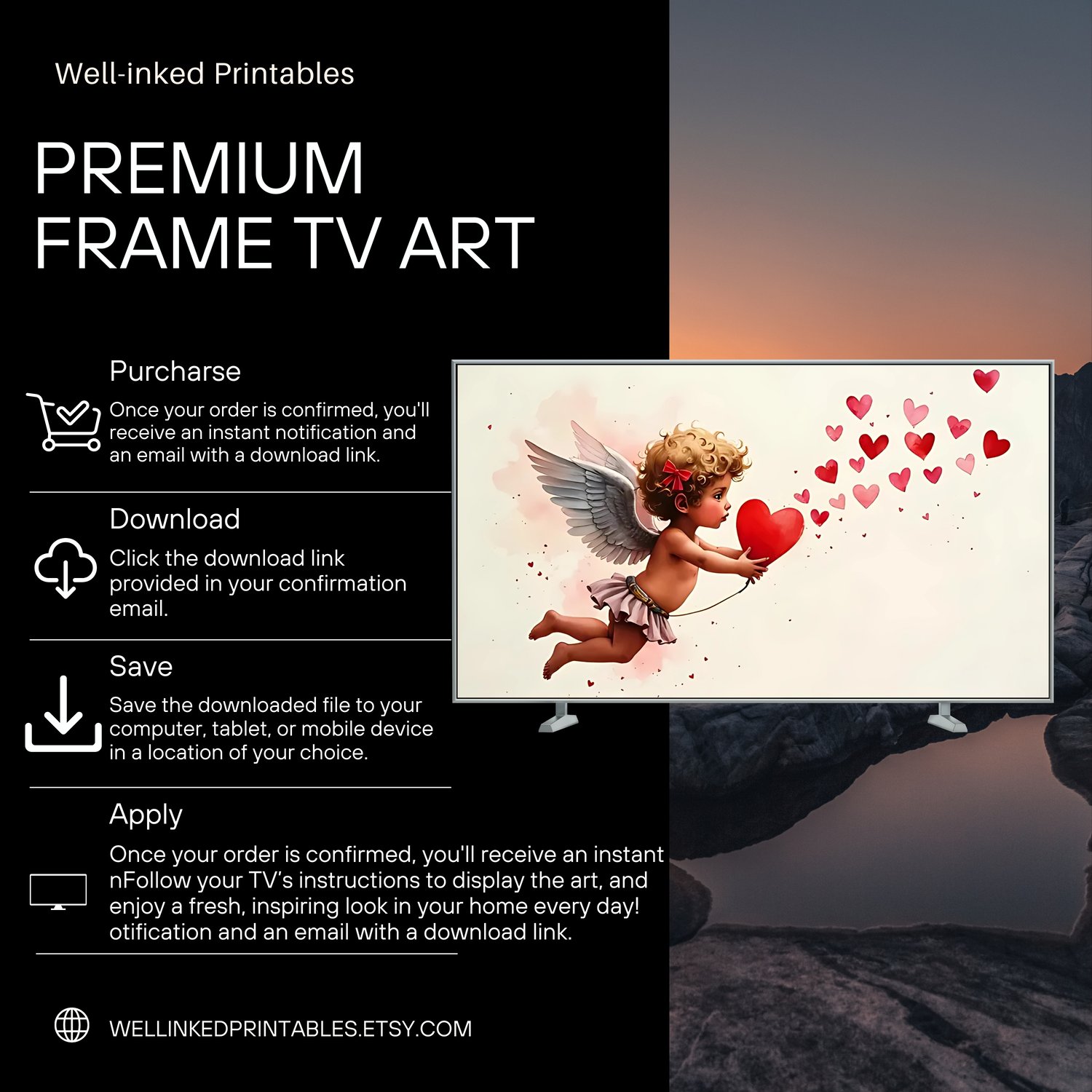 Specially formatted for frame TVs (including Samsung Frame TVs) and digital photo frames, enhancing your space with modern, romantic art