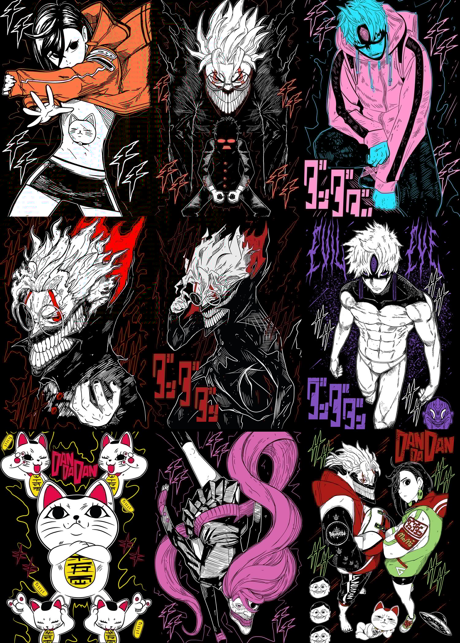 Diseño digital en alta resolución, inspirado en la fuerza, el estilo y la oscuridad de los personajes más icónicos de Dan Da Dan: Momo Ayase, Okarun, Enjoji, Aira y TurboCat