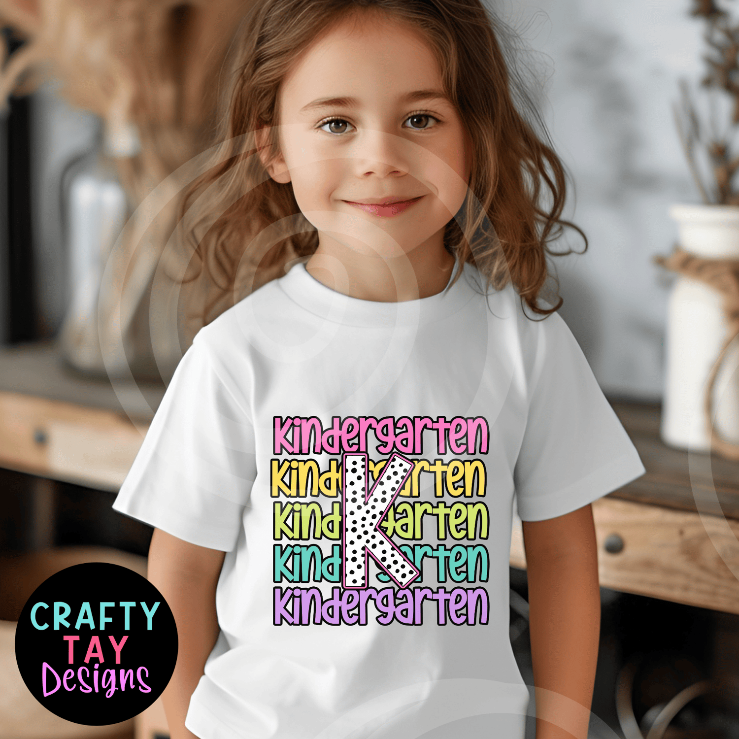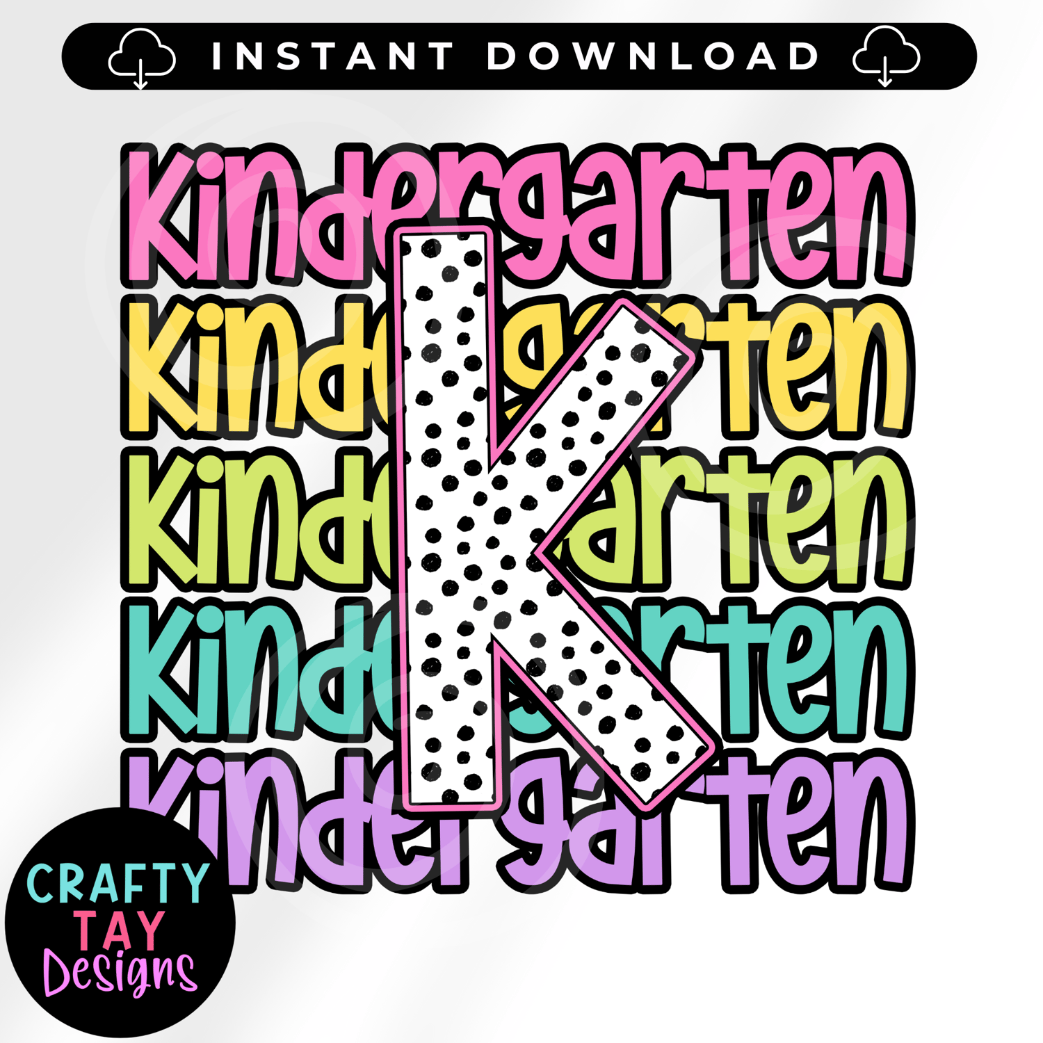 This colorful Kindergarten K design features a stacked rainbow of the word Kindergarten in fun, chunky fonts—topped with a bold black-and-white polka dot “K” front and center. It’s the perfect PNG for creating teacher shirts, classroom signs, first day of school photo props, and more!