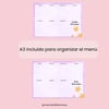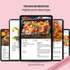 El libro digital tiene 3 apartados; el apartado de las recetas, un apartado de "minifichas" ( tamaño cromo) con las mismas recetas por si quieres imprimirlas y ponerlas con un imán en la nevera. También un apartado con dos diseños de planner semanal para utilizarlo como base.